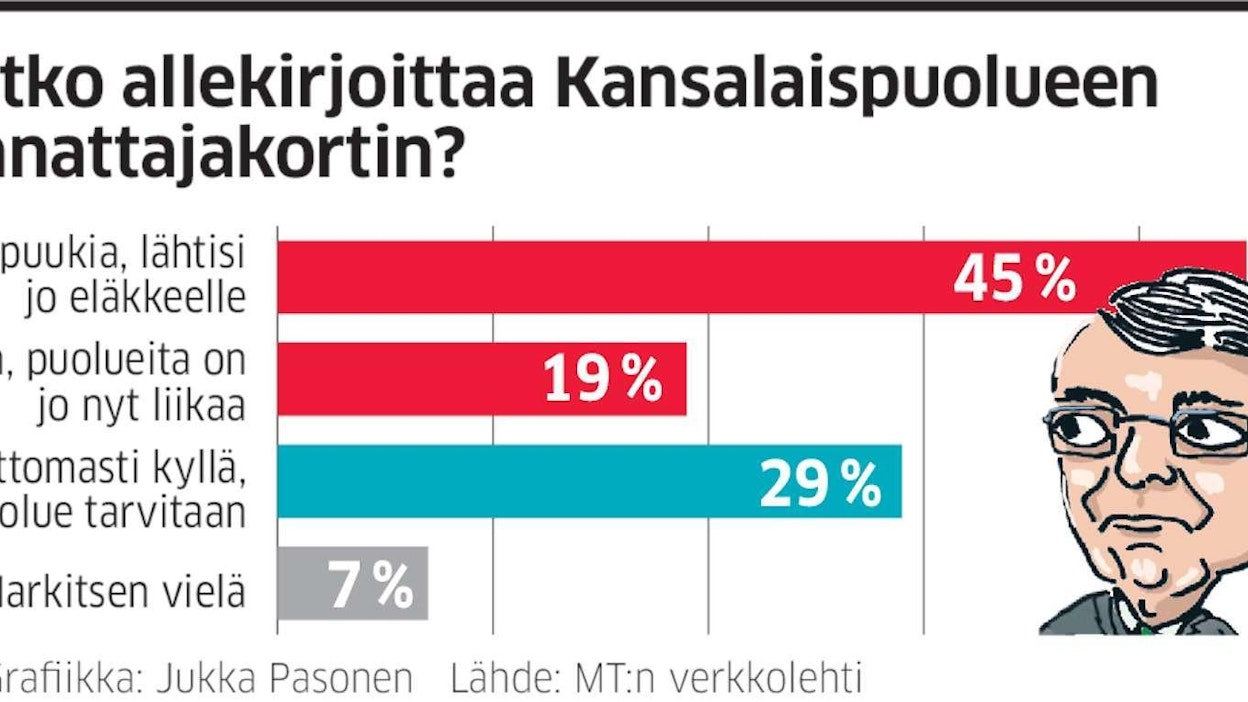 Verkkolehden viikon kysymyksessä hanketta tukee peräti 29 prosenttia. Tuolla kannatuksella Kansalaispuolue nousisi Suomen suurimmaksi puolueeksi. MT:n verkkolehden kyselyyn vastaamisesta oikeaan äänestyspäätökseen on kuitenkin matkaa. Jotain suuntaa kysely kuitenkin antaa, sillä siihen on vastannut noin 1500 henkeä.