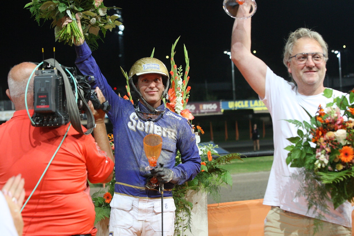 Håkan Arvidsson (oik.) juhli Solvallassa elokuussa 2022 San Moteurin Jubileumspokalenin voittoa Björn Goopin kanssa. Kuva: Ville Toivonen”San Moteur muuttaa siittolaan piakkoin. Meiltä ei ole sinne kuin 200 kilometrin matka. Ori on aiempia siitoskausia lähempänä meitä.”