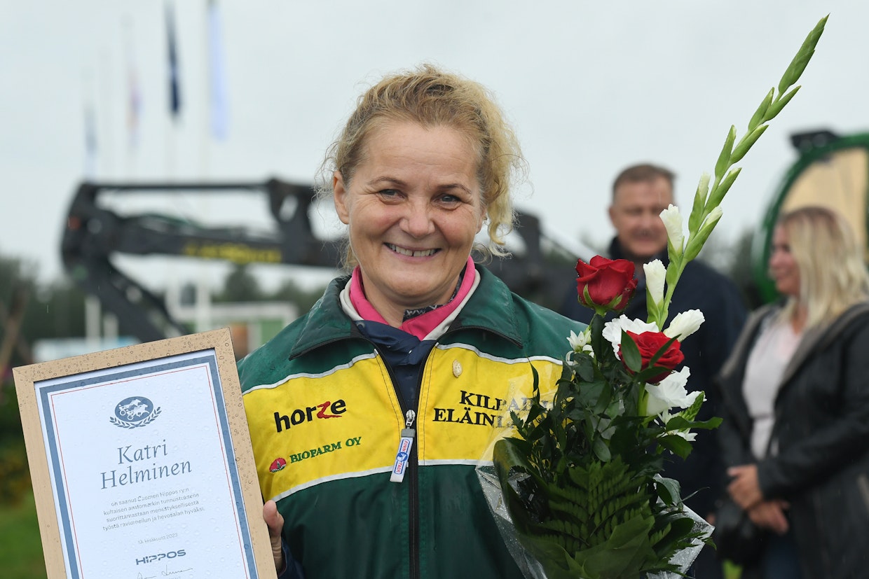 Eläinlääkäri työskenteelvä Katri Helminen palkittiin vuonna 2023 Suomen Hippoksen kultaisella ansiomerkillä. Kuva: Elina Paavola”Eihän me saataisi raveja järjestettyä ilman talkoolaisia. Senkin puoleen kerran kuukaudessa on sopiva tahti ajaa kilpaa. Ei talkoolaisilta voi vaatia loputtomasti oman aikansa uhraamista yhdistystoiminnalle.”