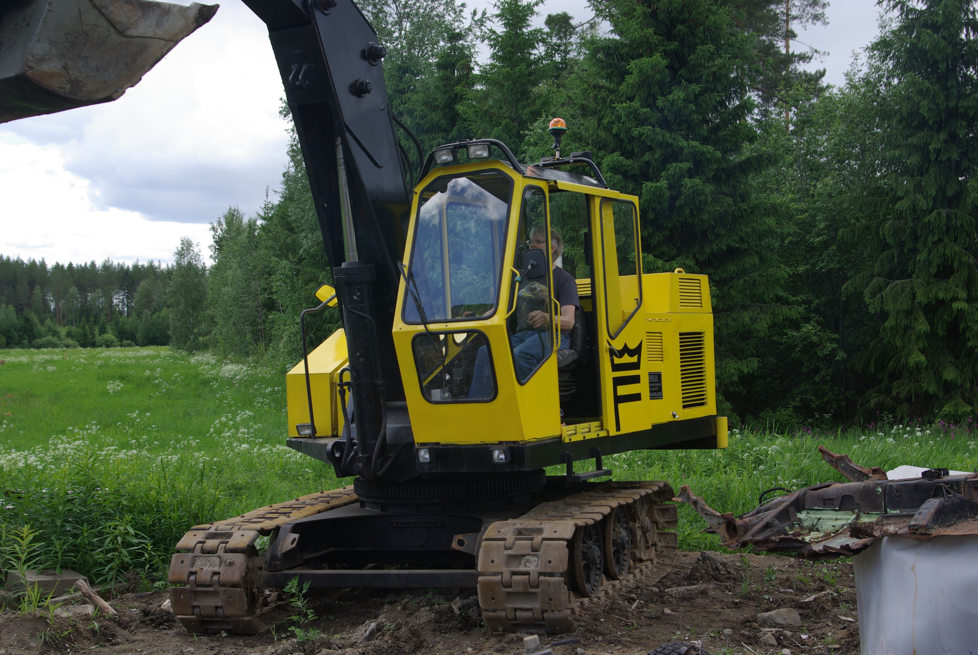 Fiskars 550 perusteellisen remontin jälkeen: Timo Sivula kaivinkoneen ohjaimissa. Luiskakauha ja sen mekanismit ovat Timon rakentamia. Myös koneen viimeistelyyn panostettiin ja alkuperäiset varoituskyltit teetettiin uudelleen. Kuva: Heikki HaapakoskiUuraisilla asuva Timo Sivula sai Fiskars 550 -kaivinkoneen yllättäen pihaansa.