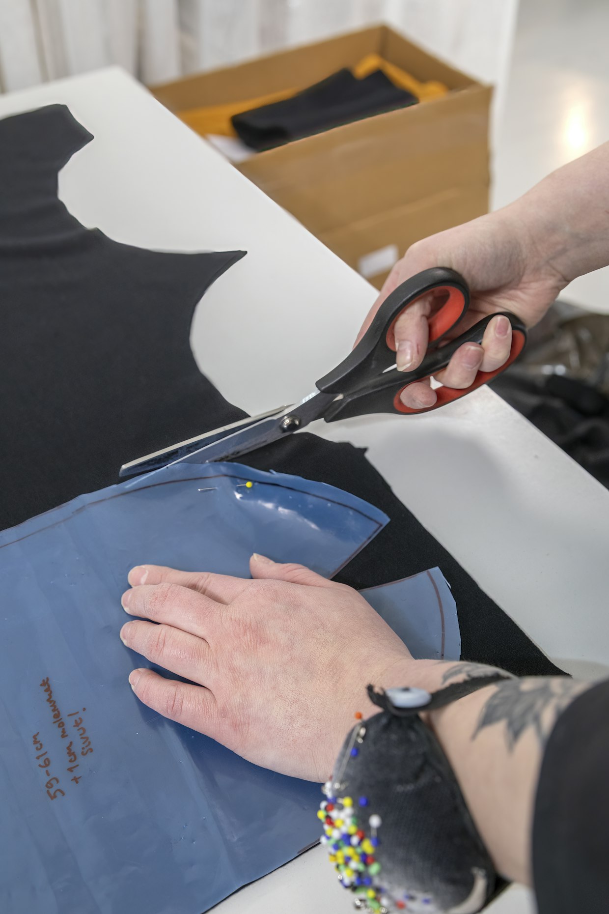 Pipot olivat ensimmäisiä Muhosen oman malliston tuotteita. Hän pyrkii hyödyntämään pienimmätkin kangaspalat esimerkiksi asusteissa, jotta hävikki olisi mahdollisimman pieni. Kuva: Timo SeppäläinenSilloin kun Muhonen ei tee esiintymisasuja, hän keskittyy töihin omalla työhuoneellaan.