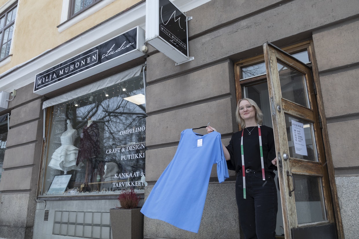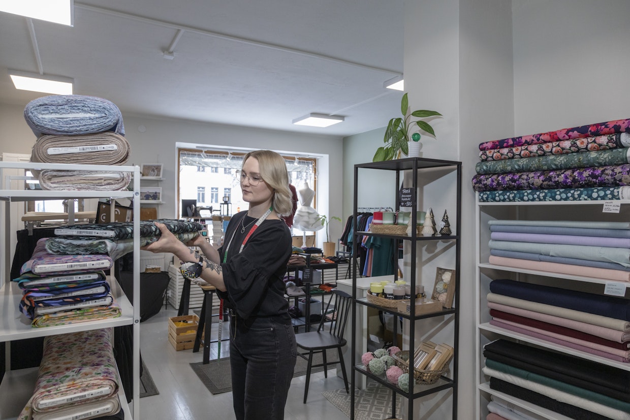 Milja Muhosessa on yrittäjähenkeä. Kun kotikaupungista katosi kangaskauppa, hän otti kankaat oman liikkeensä valikoimiin.Savonlinna