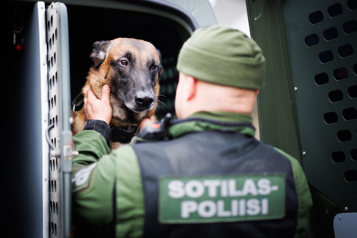 ”Ragnar tarkastaa nenäänsä käyttämällä, ettei alueella ole asiattomia henkilöitä tai esineitä. Varsinkin sulan maan aikana jälkiä on vaikea tulkita. Koira ja koirapartio tekevät yhteistyötä siinä, millaisia jälkiä lähdetään tulkitsemaan.”