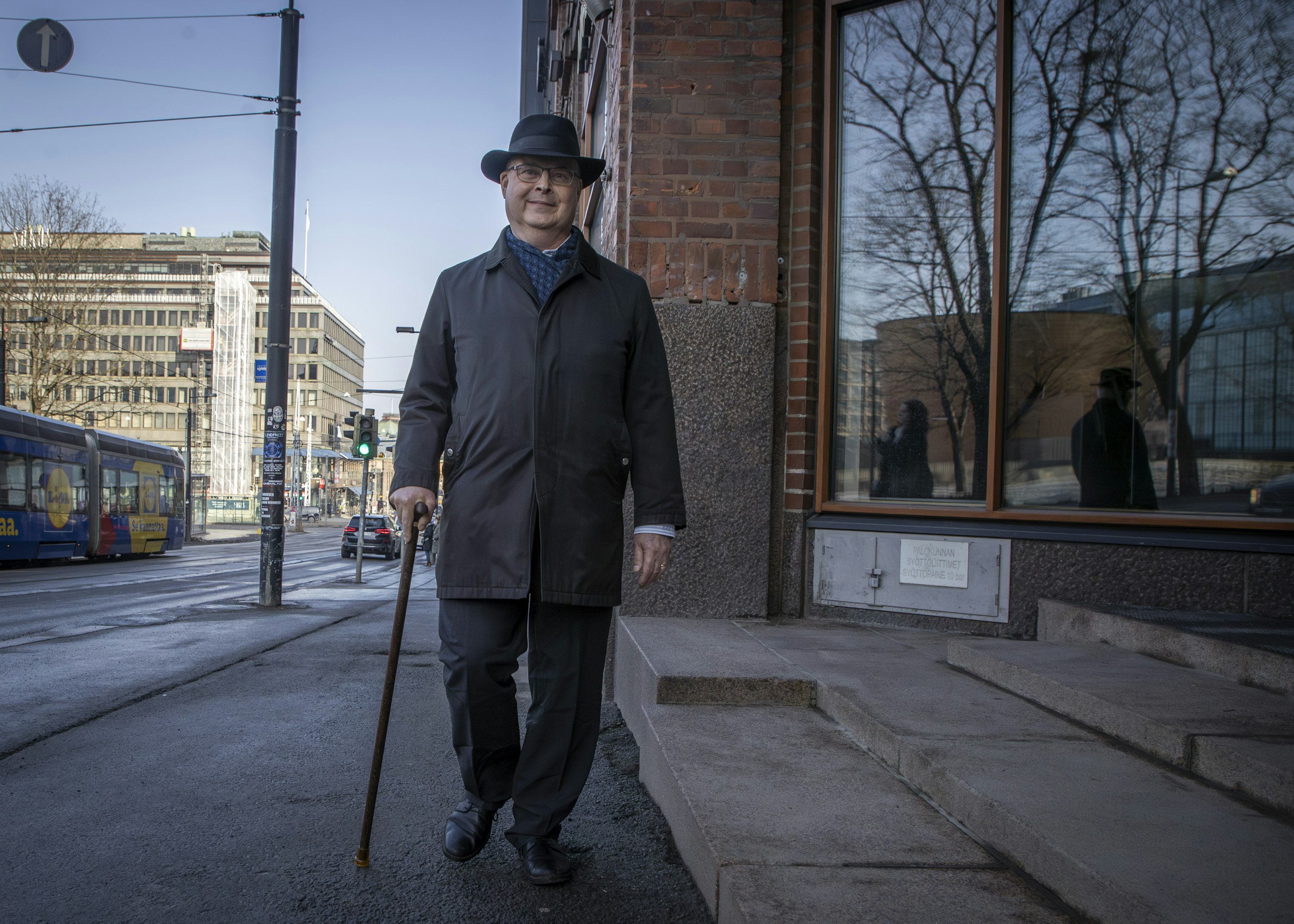 Kelan pääjohtaja Lasse Lehtonen saapuu Maalaistentaloon kävelykeppi kädessä, mutta se on hänelle lähinnä tyylikeino.