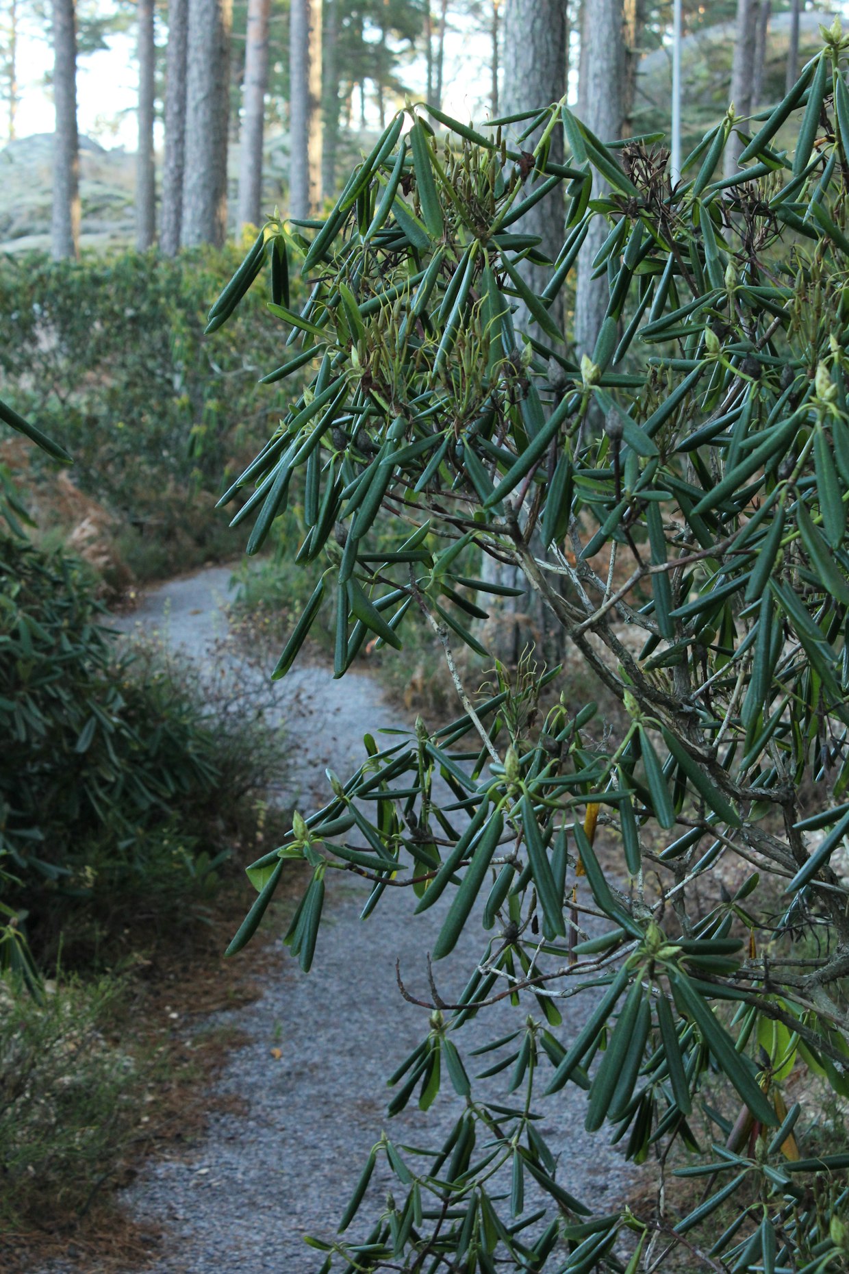 Alppiruusujen lehdet kiertyvät pakkaskeleillä tiukoiksi rulliksi. Puutarhurit kutsuvat niitä sikareiksi. Kuva: Säde AarlahtiMahoniaa käytettiinkin ennen paljon talven kukkakimpuissa ja asetelmissa. Sen lehdet ovat hieman alppiruusuja vaaleampia ja muodoltaan leveitä, joten ne erottuvat hyvin havunoksista ja muista talven koristeista.