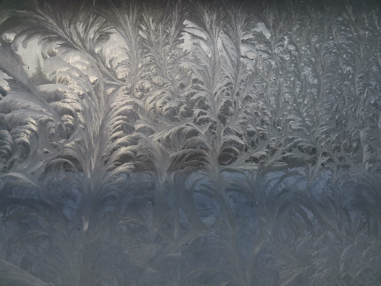 ”Navetassamme on jokunen yksinkertainen ikkunaruutu, johon navettailman kosteus tiivistyy ja kun pakkanen ulkona kiristyy, niin kukat syntyvät. Ensiksi ne ovat kirkkaita ja läpikuultavia, kunnes pakkasten jatkuessa paksunevat lumisen näköisiksi”, Sirpa Hoppula Uuraisista kertoo. Kuva: Sirpa Hoppula