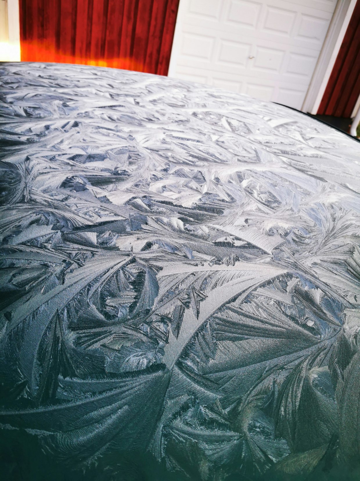 Kiteellä kuura maalaili erilaiset kuviot peltiin ja ikkunaan. ”Kummastutti kun vieressä ollut auto oli vaan ihan tasaisen kuurainen”, Pertti Leminen kertoo. Kuva: Pertti Leminen