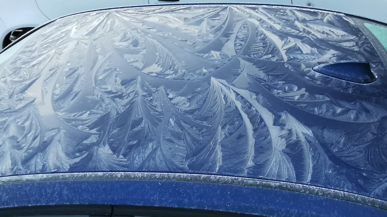 Kokkolassa likakerroskaan ei estänyt luontoa taiteilemasta tila-auton takalasiin kukkasia. Kuva: Pasi PorvariMiten sitten määrittyy, millainen kuurakuviosta milloinkin tulee: sulkia, kukkia vai kenties kiemurtavia käärmeitä?