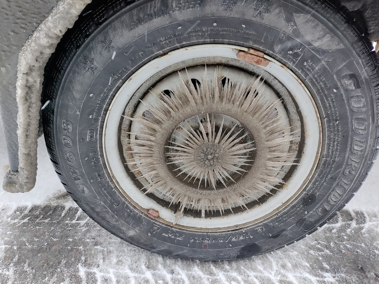Peräkärry sai vanteisiin jääkukat Ähtärissä. Kyseessä ei ole kuura, mutta talven tekele kuitenkin. Kuva: Hannu Pennala