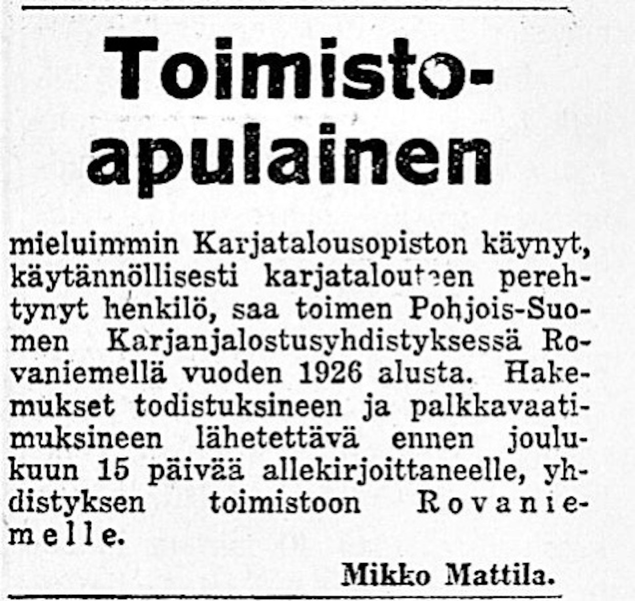 Toimistoapulaista haettiin Maaseudun Tulevaisuuden ilmoituksella marraskuussa 1925. Kuva: Kansallisarkisto37 vuotta vanha ruuna.