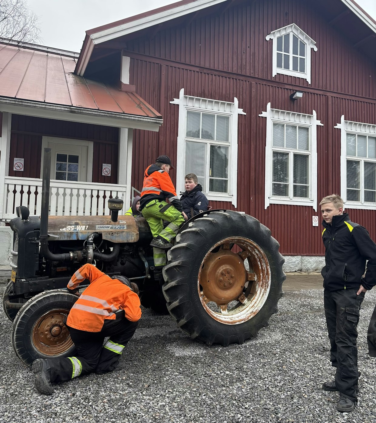 Traktoria kunnostavat Leppälä-talon katoksessa kevään ja kesän mittaan Leppälänkylän yläkoulu- ja lukioikäiset pojat.