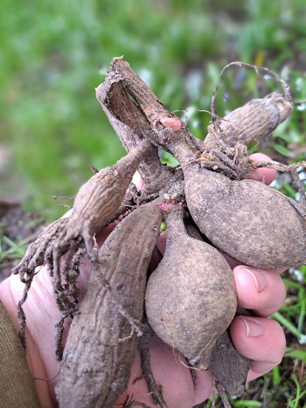 Jaloleinikin monihaaraiset mukulat muistuttavat pieniä hämähäkkejä. Niitä, samoin kuin kruunuvuokon (Anemone coronaria) tummia mukuloita, on hyvä liottaa ennen kylvöä. Kuva: Säde AarlahtiUutena hankittavat juurakot ovat monesti pieniä ja kärsivät varastoinnin aiheuttamasta kuivumisesta. Niiden kohdalla on hyvä muistaa, että kasvu vie aikaa. Pienikin, ryppyinen kasvinalku osoittautuu usein varsin elinkykyiseksi, kunhan se saa suotuisat kasvuolot ja aikaa kehittyä.