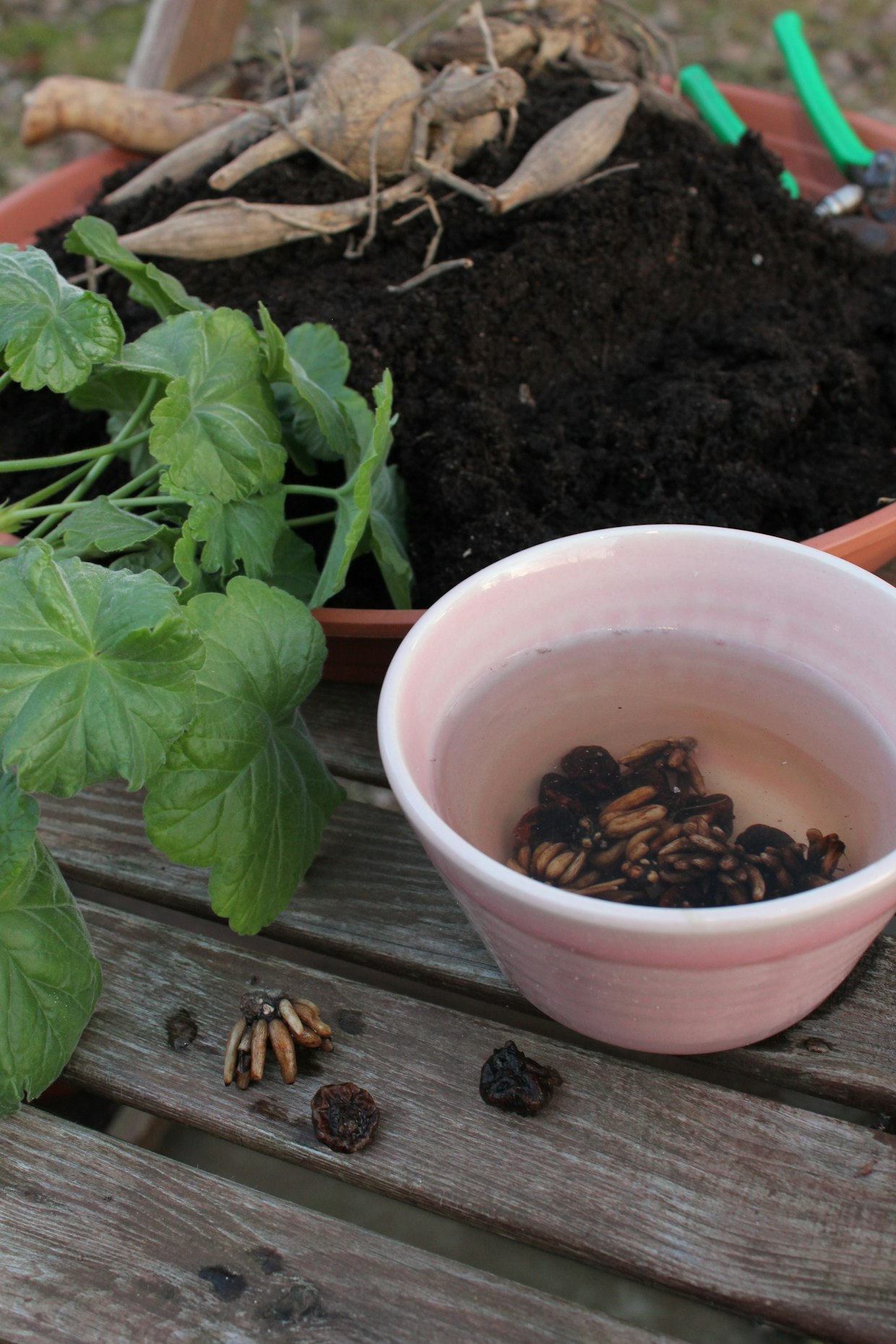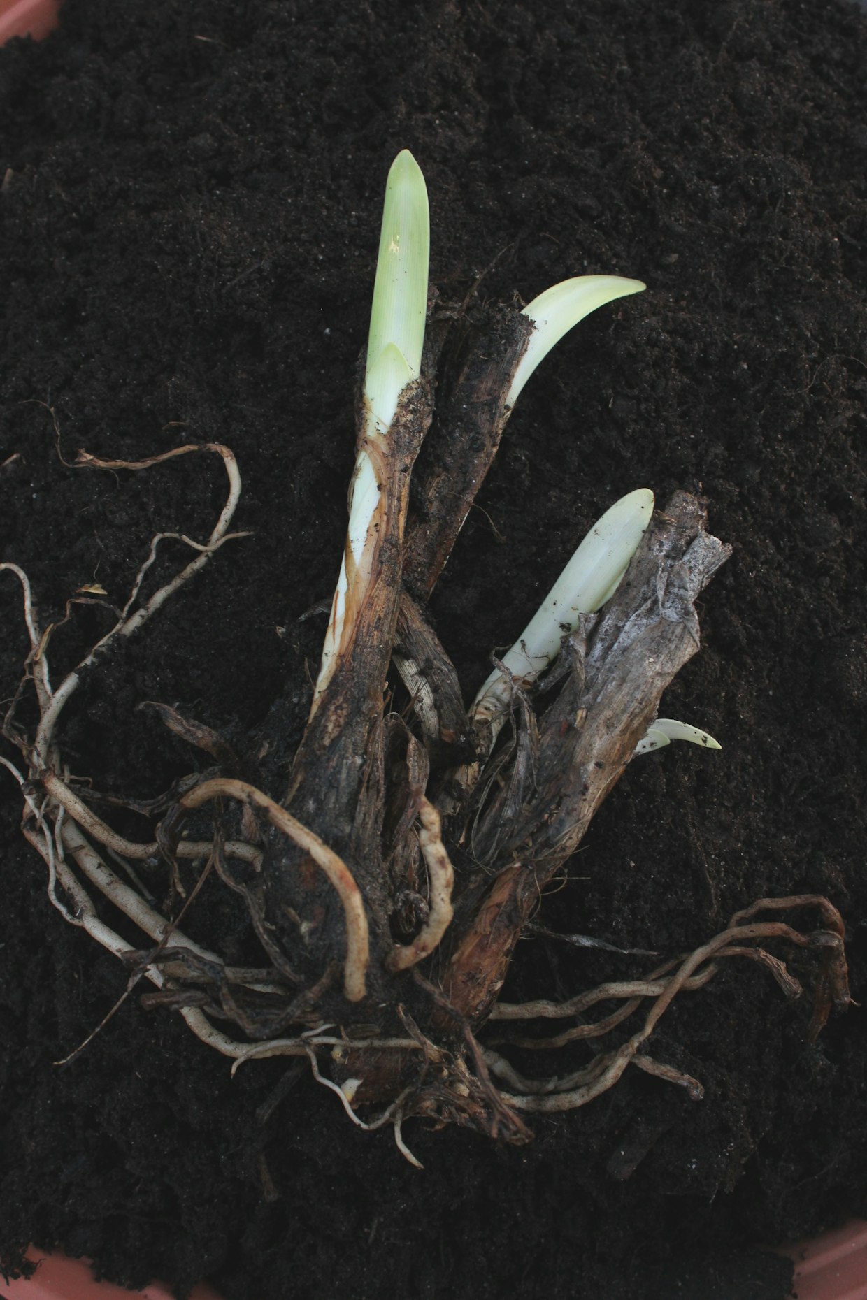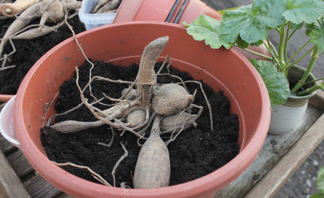 Daaliat esikasvatetaan ruukuissa tavanomaisessa kukkamullassa. Juurakot peitetään kevyesti mullalla niin, että edellisen vuoden varrentynkä jää näkyviin mullan pinnalle. Kuva: Säde Aarlahti