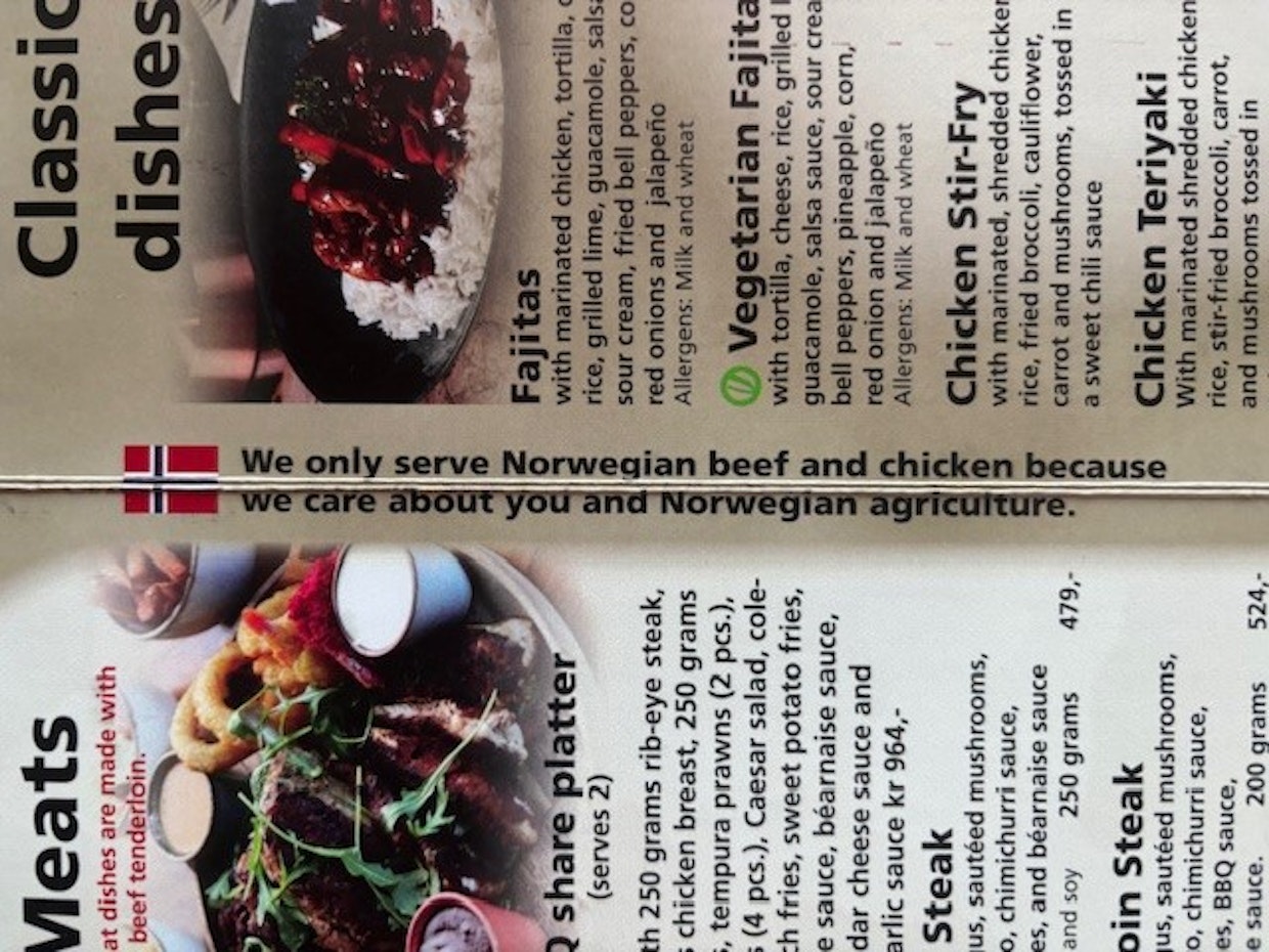Hämmentävästi keskustelumme kääntyy myös norjalaiseen maatalouteen ja ruoantuotantoon. Kerron laskijalle nähneeni aiemmin päivällä ravintolassa kyltin, jossa kerrottiin, että ”kaikki tuotteemme ovat norjalaisia arvostuksesta sinua ja norjalaista maataloutta kohtaan”.