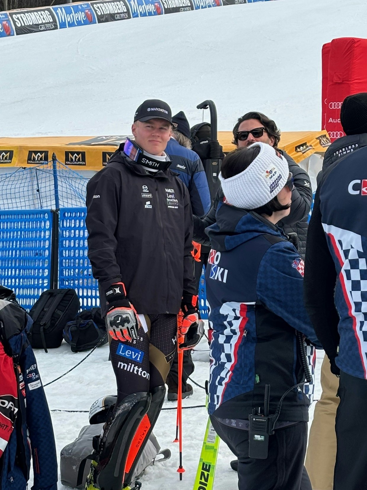 Eduard Hallberg Hafjellin pujottelun maalialueella yhdessä entisen huippulaskijan, Marcus Sandellin kanssa. Hallberg oli cup-päätöksen avauskierroksen jälkeen kahdeksantena. Kuva: Laura RuoholaMutta kaikki ei ole pelkästään päivän paistetta ja onnistumista. Haastattelua tehdään Norjan laskettelukeskus Hafjellissa, jossa ei lunta ole kuin nimeksi.