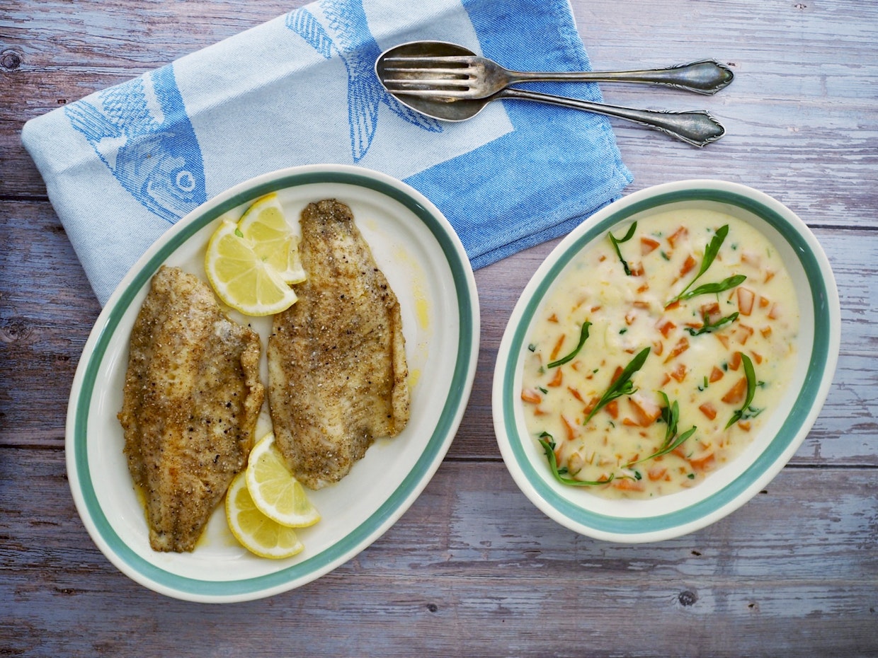 Rapea paistopinta ja pehmeä lisuke tekevät annoksesta tasapainoisen – kurkku ja herneet tuovat mukaan raikkautta ja väriä. Kuva: Tiina RantanenPaistettuja ahvenfileitä ja mummolan porkkanamuhennosta