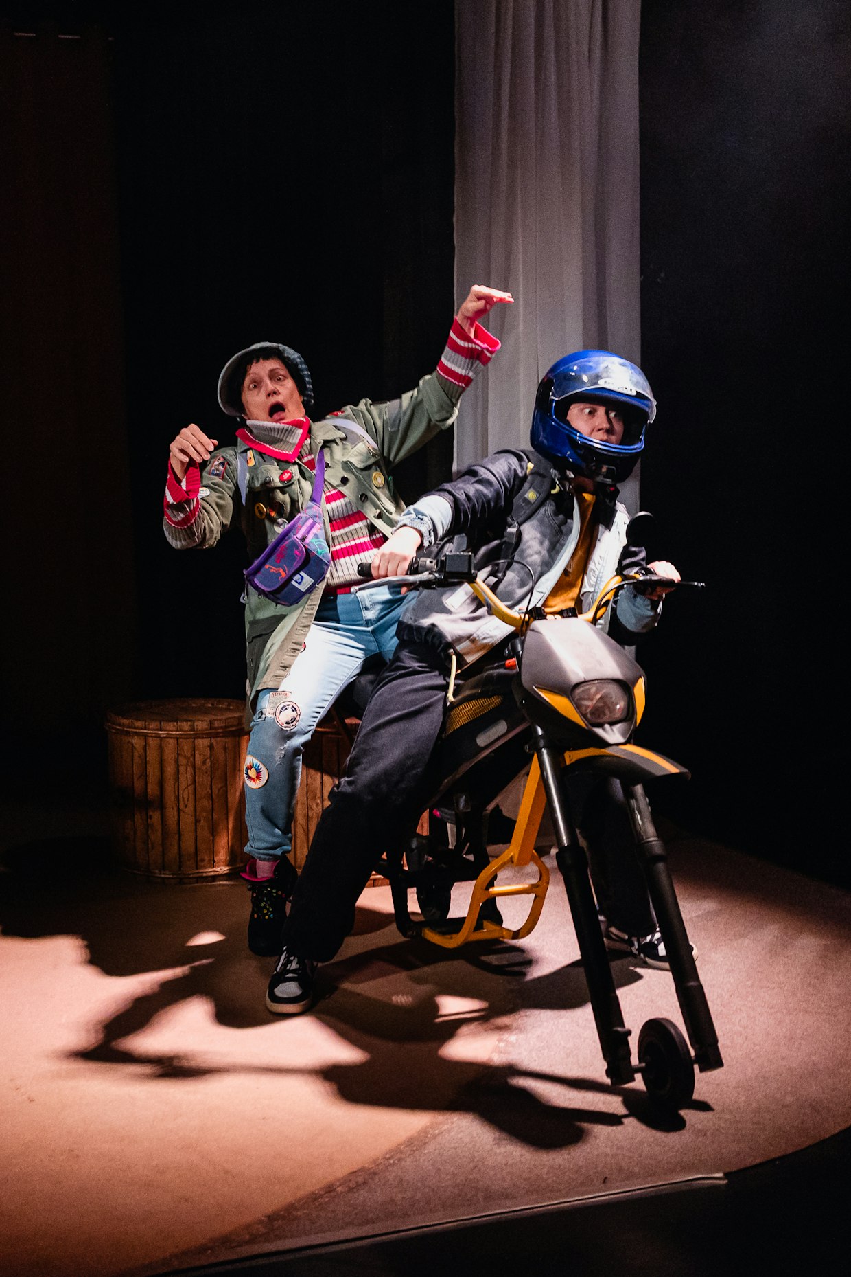 Teija Töyry ja Sisu Kaukonen eläytyvät mopokolariin. Näyttelijät tekevät notkeat ja hauskat roolisuoritukset. Lavastus elää hienosti tarinan mukana.Ikävä kyllä tarina puolentoista tunnin näytelmästä irrotetaan keskeltä aimo kimpale ”tervatauoksi”, jolloin yleisöä valistetaan suomalaisen metsätalouden vaarallisuudesta: ”Ajatelkaa, Suomen metsiä hakataan vessapaperiksi!”
