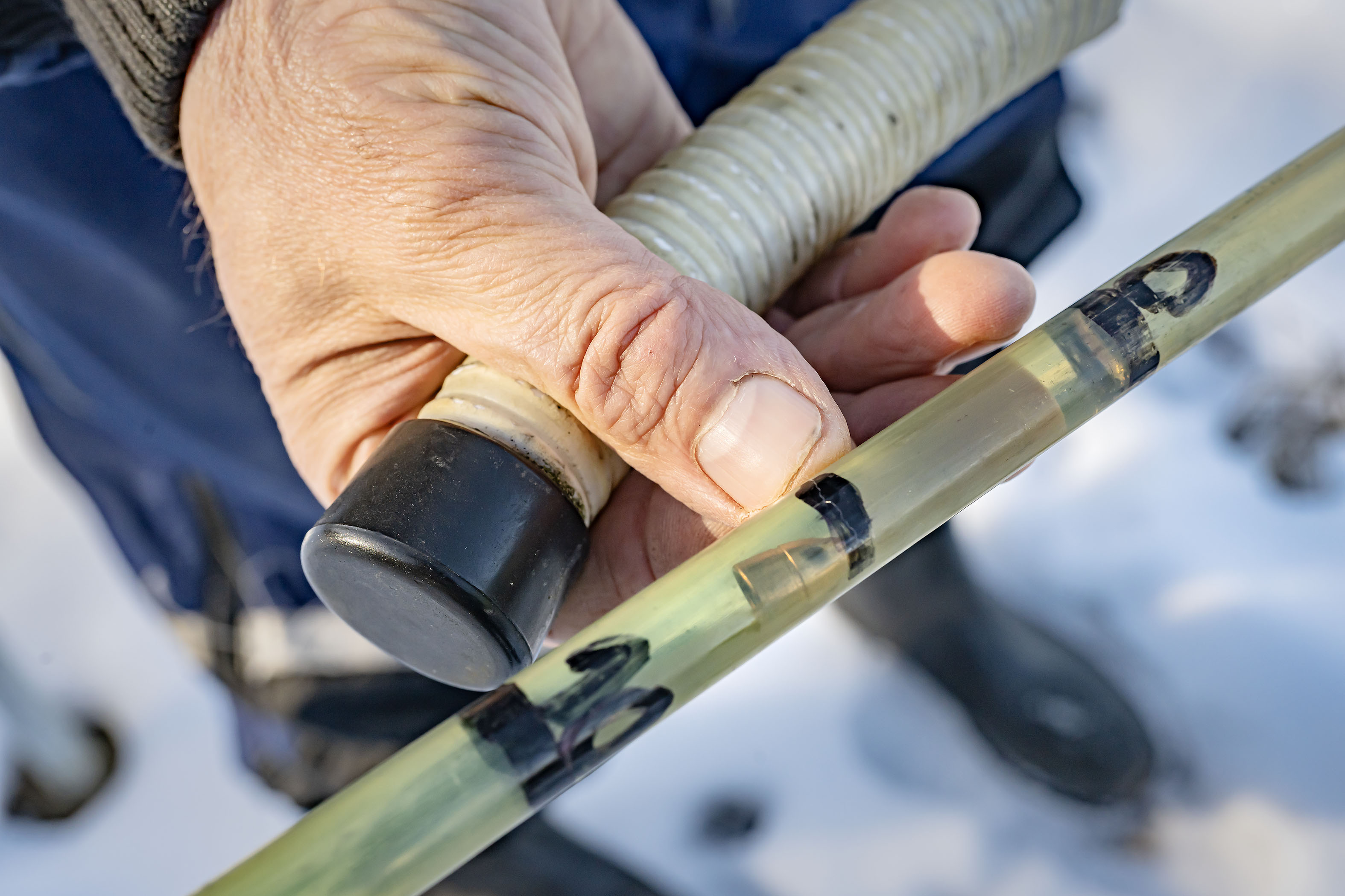 Roudan syvyyttä mittaava luotikeppi on tänä talvena tallentanut selvästi tavanomaista suurempia lukemia. Kuva: Johannes TervoEnnätyssyvyyksiin painunut routa on jäädyttänyt vesijohtoja eri puolilla maata tänä talvena totuttua enemmän.