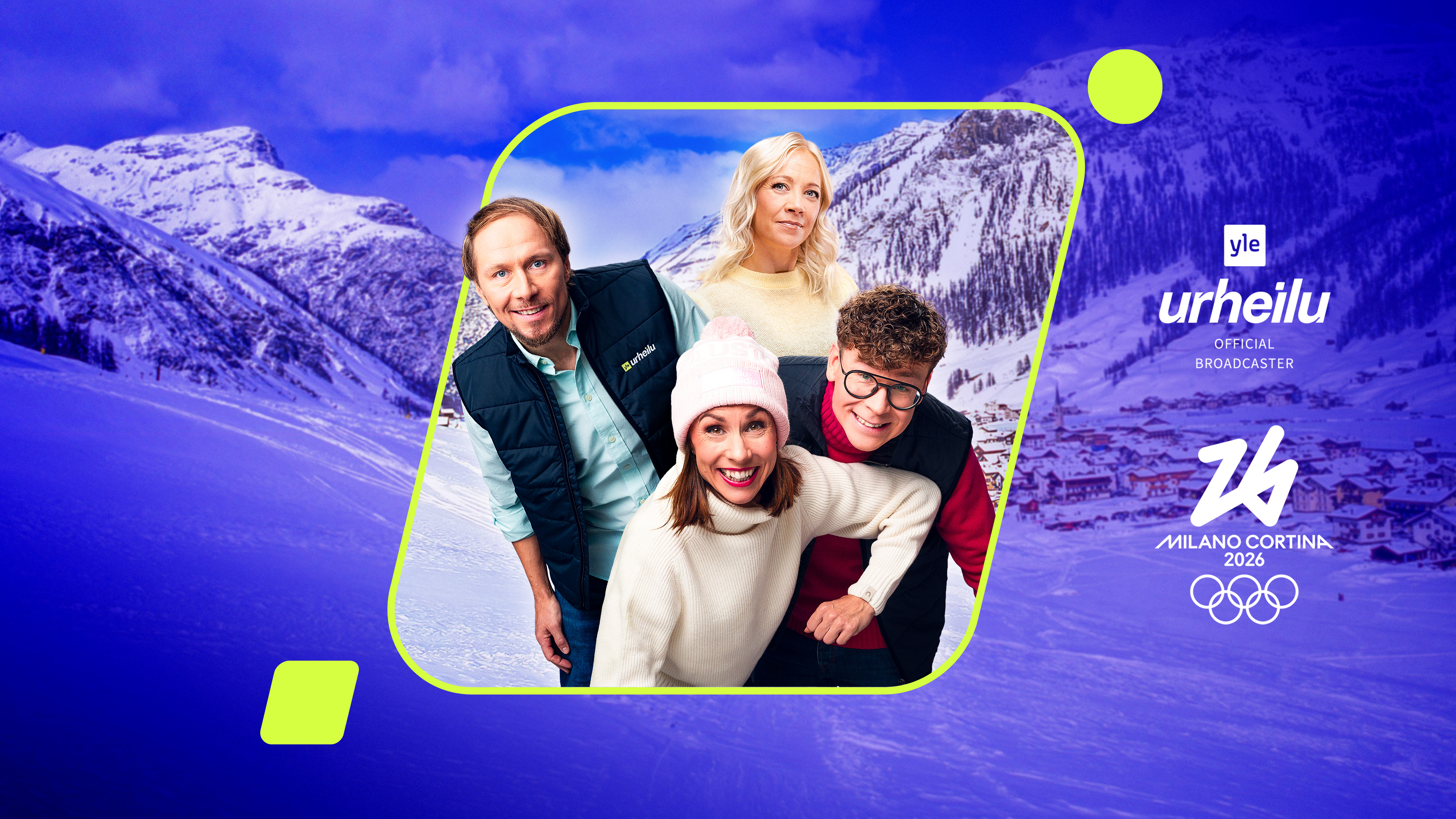 Milanon ja Cortinan talviolympialaiset näkyvät ja kuuluvat Ylen kanavilla 6.–22. helmikuuta. Tv-kanavien lisäksi lähetyksiä voi seurata Yle Areenassa ja kuunnella Yle Radio Suomessa.