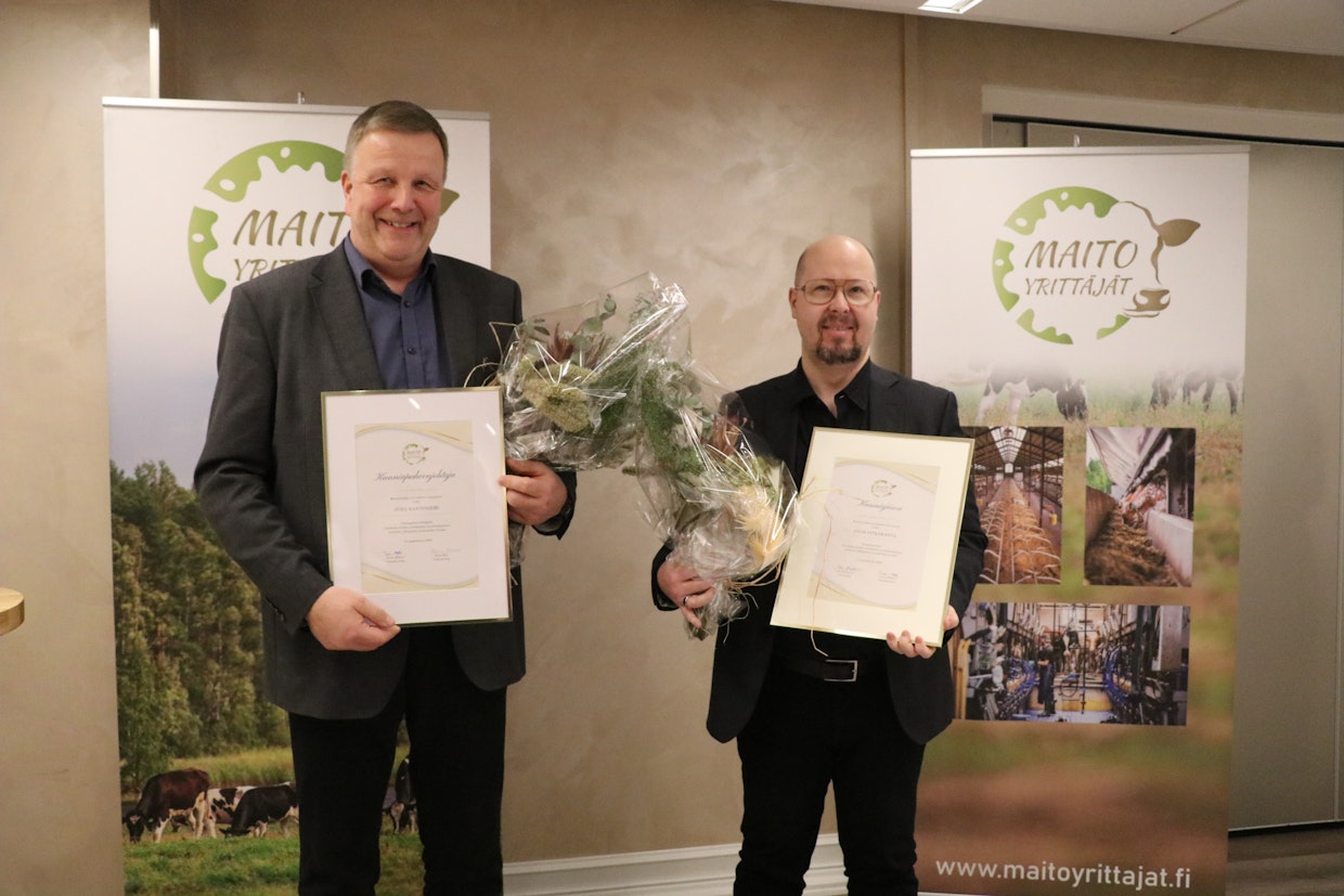 Maitoyrittäjät ry kutsui Juha Kantoniemen (vasemmalla) kunniapuheenjohtajaksi sekä Jouni Pitkärannan kunniajäseneksi. Kuva: Paula AntikainenArtikkelin aiheet- Osaston luetuimmat