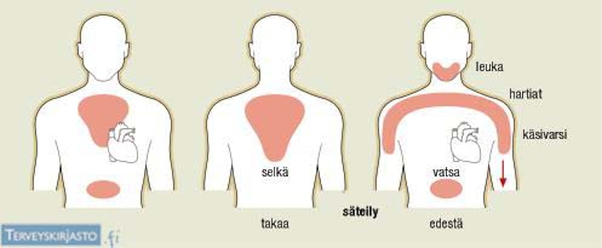 Sepelvaltimotaudin rintakivun sijainti. Vasemmalla: puristavan rintakivun alue keskellä rintalastaa ja sen ympärillä; joskus kipu voi tuntua ylävatsalla. Keskellä: Kipu voi säteillä keskelle selkää lapojen väliin. Oikealla: Kivun säteily leukaperiin, hartioihin, olkavarsiin ja vatsaan. Kuva: TerveyskirjastoJos aiemmin terveelle henkilölle tai sepelvaltimotautipotilaalle tulee äkillisesti edellä kuvattuja oireita, kannattaa soittaa hätäkeskukseen (numero 112), jonka lähettämän ambulanssin ensihoitohenkilöstö arvioi ja toteaa hoidon tarpeen.