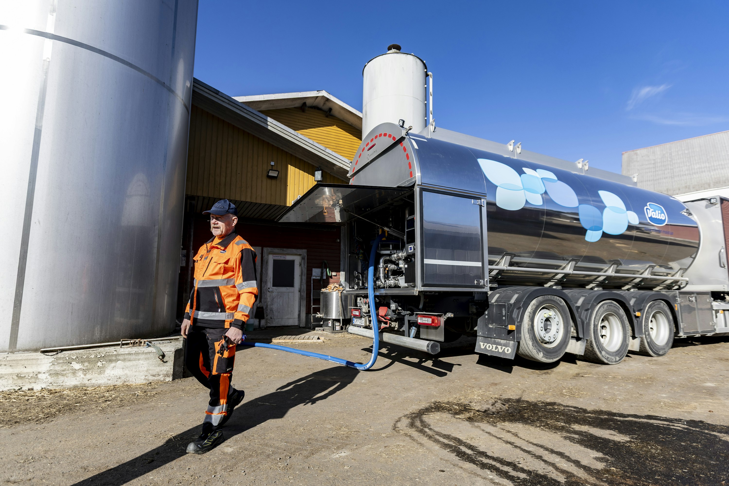 Tullaan Maitokuortti oy:n navetan pihaan. Kohtakangas liittää letkun toiseen maitosiiloista ja käynnistää pumpun.