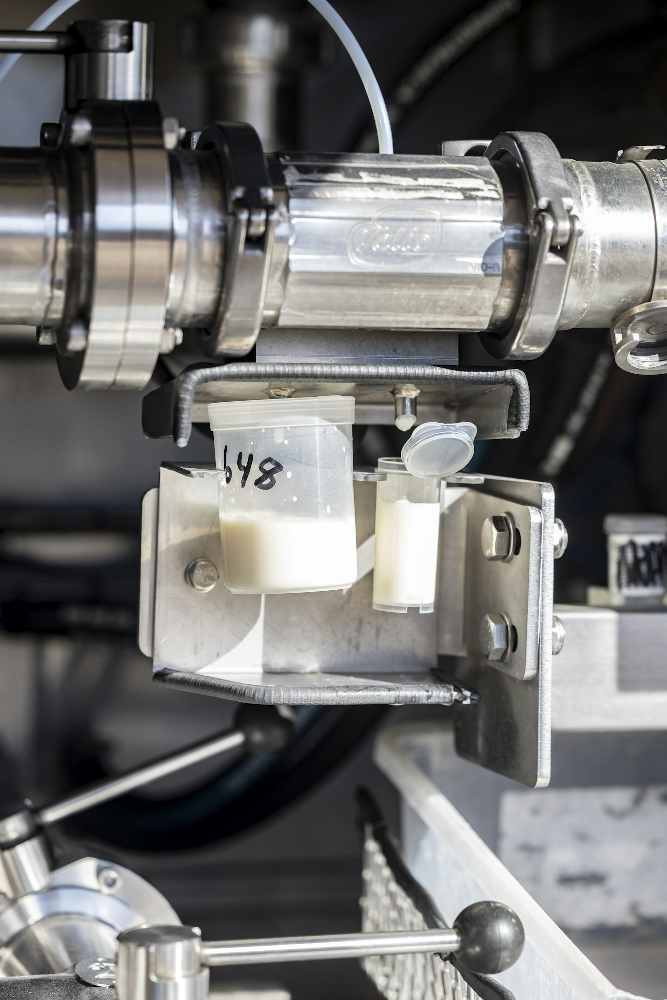 Pumpun käydessä kahteen pieneen muoviputkeen tihkuu maitoa. Isompaan kerätään kuormanäyte ja pieneen tilanäyte.
