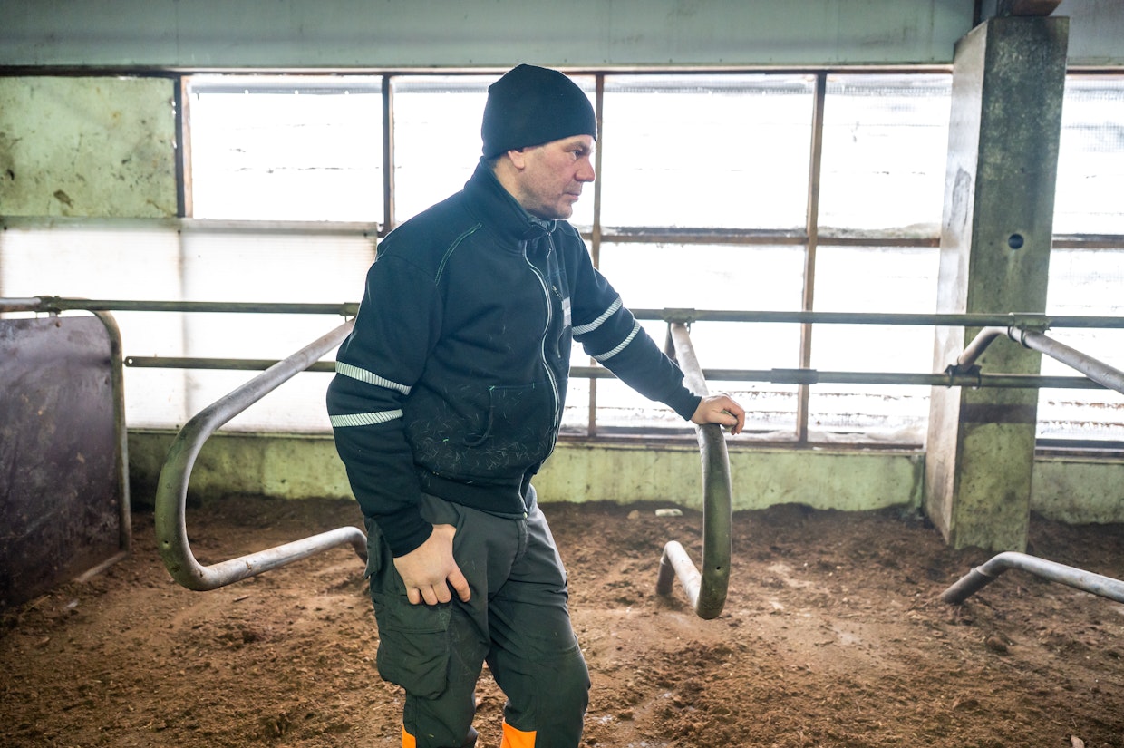 Erno Rastilan takana näkyy ilmapaljeverhot, joiden uusiminen on mahdollisesti seuraava investointi tilalla. Kuva: Kimmo HaimiPakaraisen tilan seuraava hyvinvointi-investointi on luultavasti uudet ilmapaljeverhot.