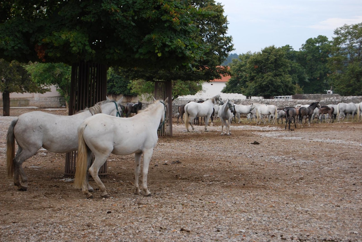 Tuolla näkyy ensimmäinen lauma, nuoria hevosia kaikissa harmaan sävyissä. Olemme saapuneet lipizzanhevosten alkukotiin!