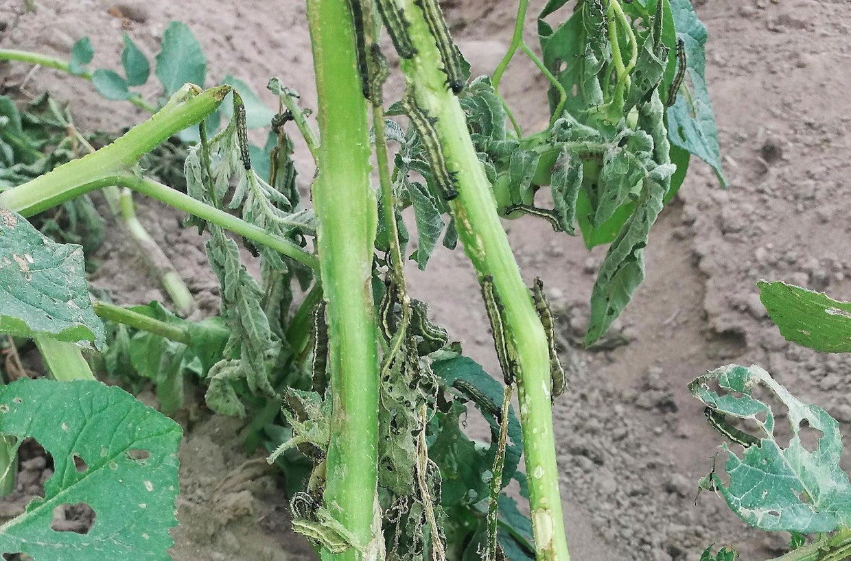 Gammayökköset ovat tuhonneet kasvustoja etenkin eteläisessä Suomessa Pohjanmaan ja Pohjois-Karjalan korkeuksille asti. Osa tiloista säästyy kuitenkin tuholaisilta kokonaan, arvioi Juha Sohlo Pro Agria Oulusta. Kuvassa toukkia perunavaossa. Kuva: Eino HeinolaHelteessä viihtyvä tuholainen, gammayökkönen, on levinnyt jo ainakin Oulun korkeudelle, mahdollisesti pidemmällekin, kertoo kasvinsuojelun huippuosaaja Juha Sohlo Pro Agria Oulusta.