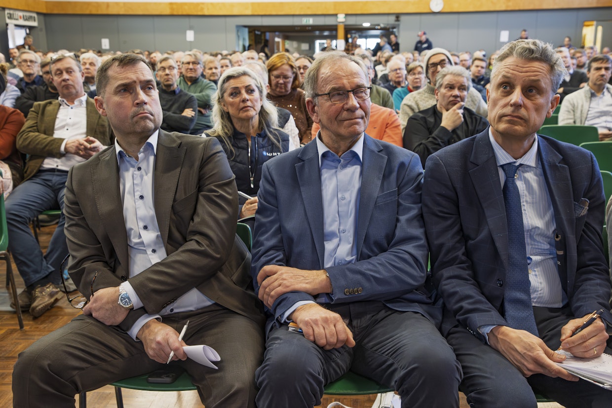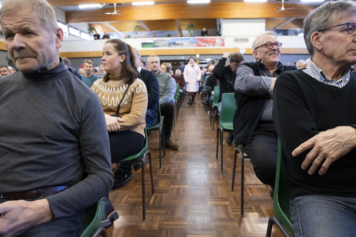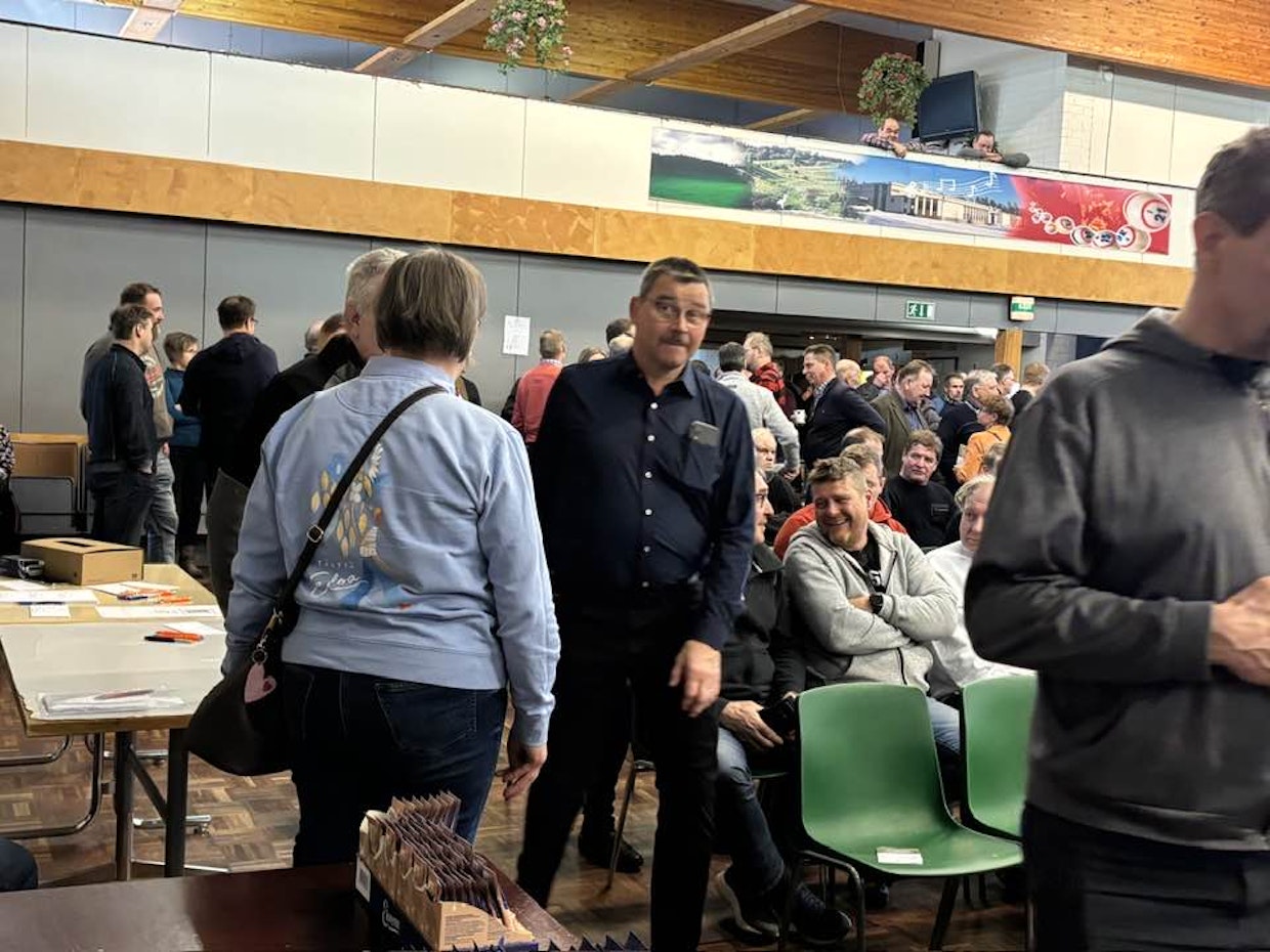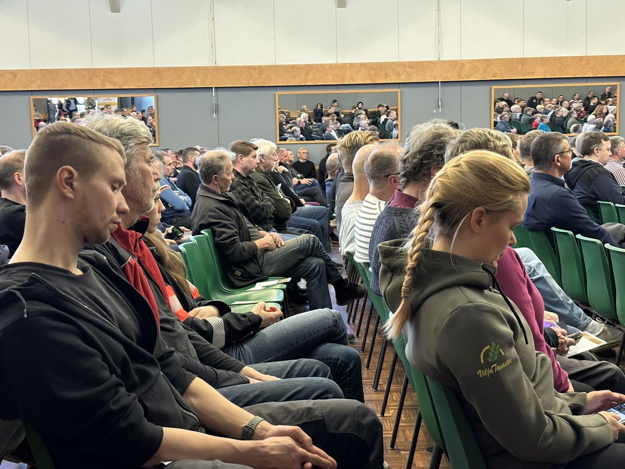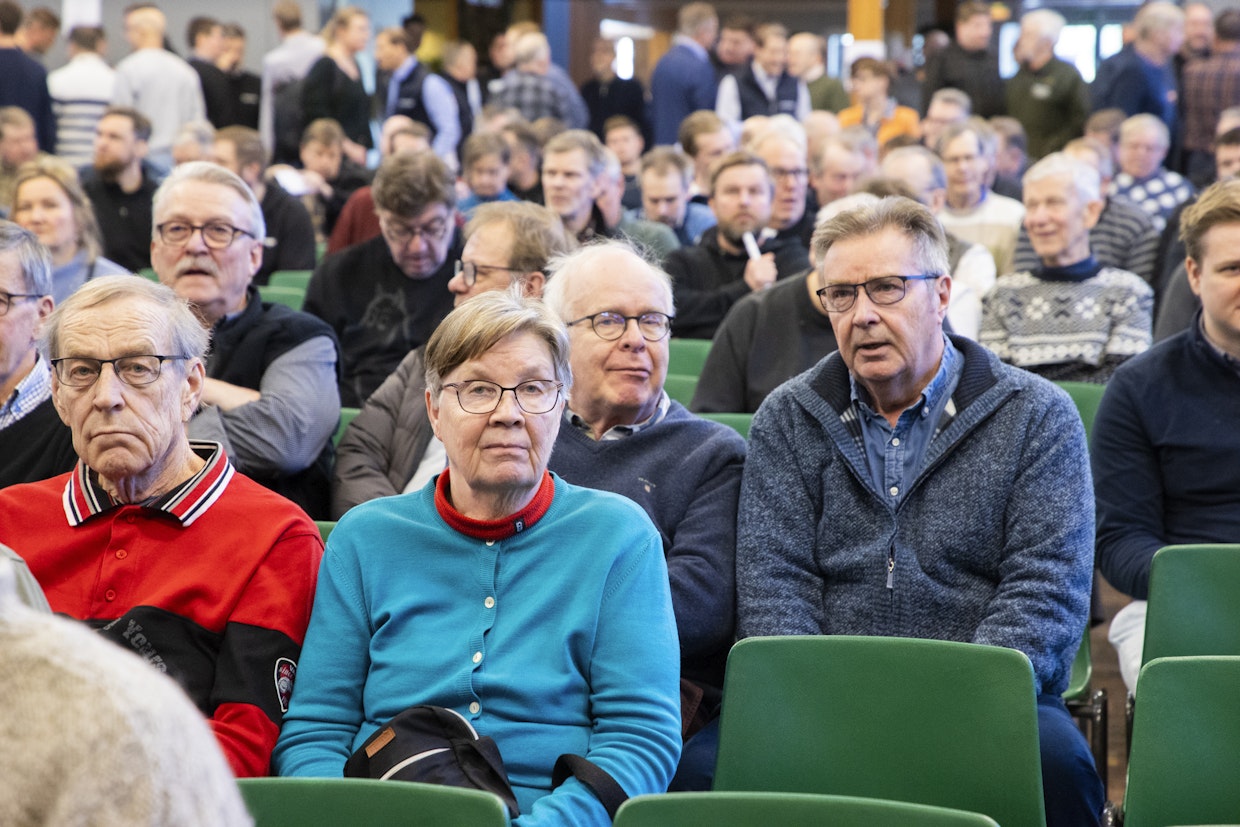 Kello 12: Mikko Lindberg avasi kokouksen. Tälläkin kertaa Teeriharjun sali on liki täynnä.