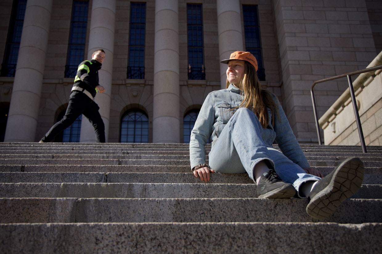 Vihdistä Massey Fergusonilla eduskuntatalolle saapunut Heta Hoikkanen kertoi etukäteen jopa tarkistaneensa, saako Mannerheimintielle tuoda traktoria. Taustalla Mikko Salmu. Kuva: Lari LievonenVihdistä Massey Fergusonilla lähtenyt Heta Hoikkanen ajoi marssille heti navetan aamutöiden jälkeen. Poliisin saattamasta marssijonosta hän myöhästyi vartilla, mutta saapui silti eduskuntatalolle.