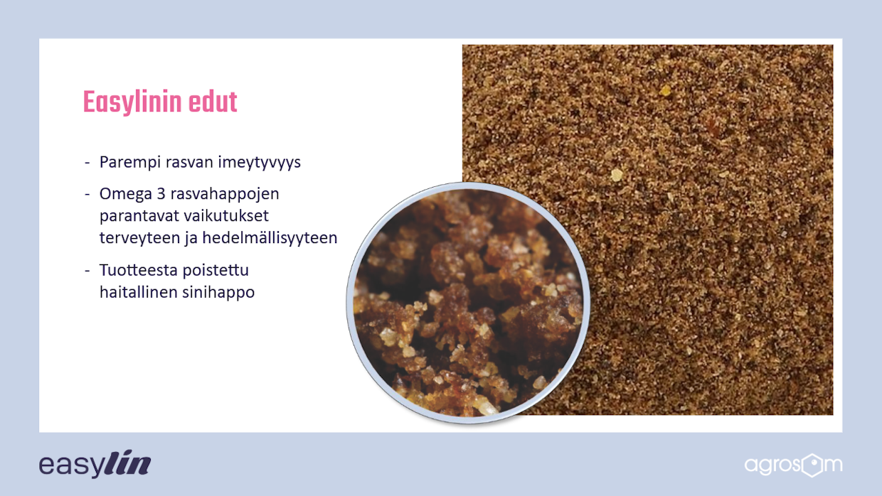 Easylin on extrudoitua pellavarouhetta ja muistuttaa ravintoaineiltaan paljon kevään ensimmäistä nurmea, jossa on ravintoaineet parhain päin ja hyvin imeytyvissä muodoissa.