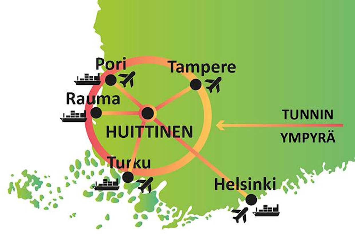 Huittisten tunnin ympyrä: Puolen tunnin ajomatkan sisällä asuu 65 000 ihmistä ja tunnin säteellä sijaitsee suuria kasvukeskuksia ja lähes 700 000 ihmistä.Sijainti, sijainti, sijainti