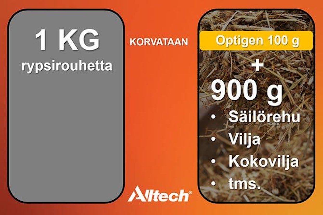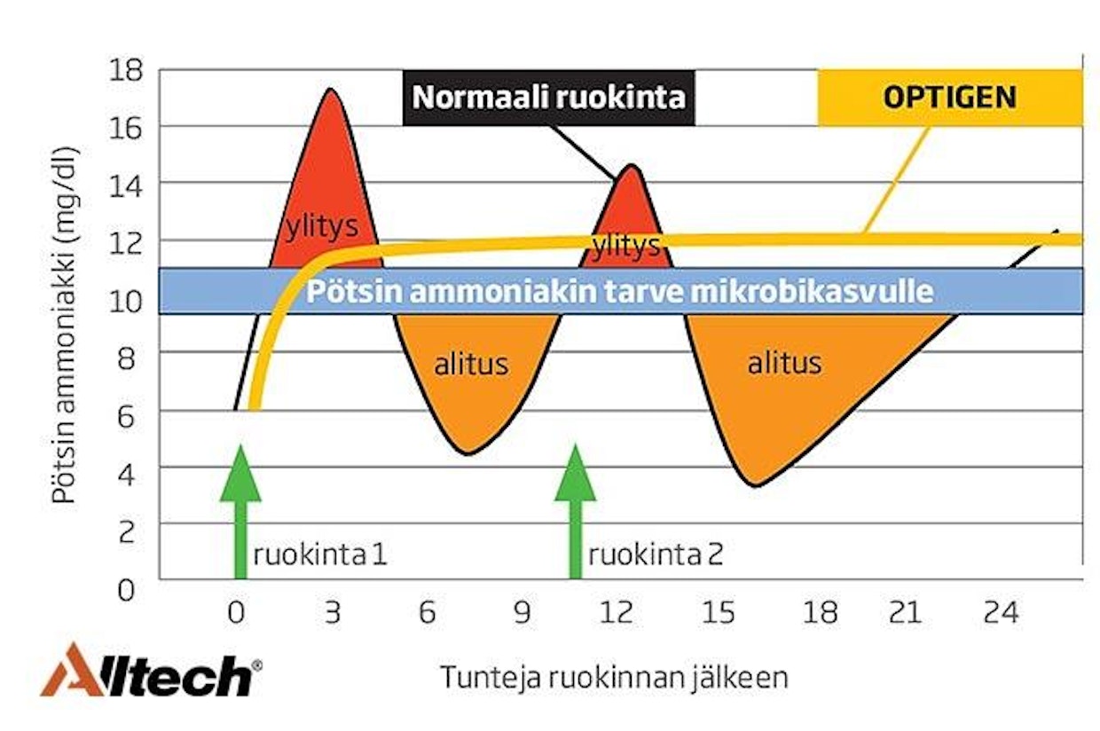 Valkuaisrehujen eli käytännössä rypsirouheen hinnan noustessa katse kääntyy vaihtoehtoihin ja hyvä niin! Tuote nimeltä Optigen® on käytössä rypsiä halvempi valkuaisrehu, josta irtoaa pötsissä tasaisesti typpeä pötsimikrobien tarpeisiin. Lisääntynyt mikrobien määrä lisää säilörehun kuidun sulatusta, maitomäärää sekä mikrobivalkuaisen tuotantoa. Lypsylehmän tärkein valkuaisen lähde on nimittäin mikrobivalkuainen, ei suinkaan rypsirouhe!Ruokinnassa on syytä tavoitella aina riittävää valkuaispitoisuutta, mutta eri rehujen keskinäinen tasapaino sekä sulamisnopeus vaikuttavat myös kokonaisuuteen. Tyypillisesti kotoisten rehujen (eli säilörehun ja viljan) lisäksi annostellaan rypsirouhetta niin paljon, että tuotos miellyttää. Menetelmä on ihan toimiva, mutta ei suinkaan kustannustehokkain tai terveellisin. Taloudellisesti kannattavin ruokinta rakennetaan pötsin hyvinvoinnin kautta ja siinä Optigen® on ainutlaatuinen raaka-aine.