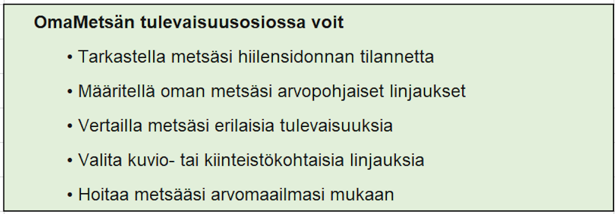 Tulevaisuusosio on kaikkien OmaMetsän käyttäjien saatavilla. Oman metsänhoidon suunnan voi selvittää täyttämällä metsien arvoja ja hyötyjä käsittelevän kyselyn, joka löytyy OmaMetsän etusivulta. Kyselyssä määritellään omaa metsänkäyttöä koskevat arvot seuraavalle viidelle vuodelle.