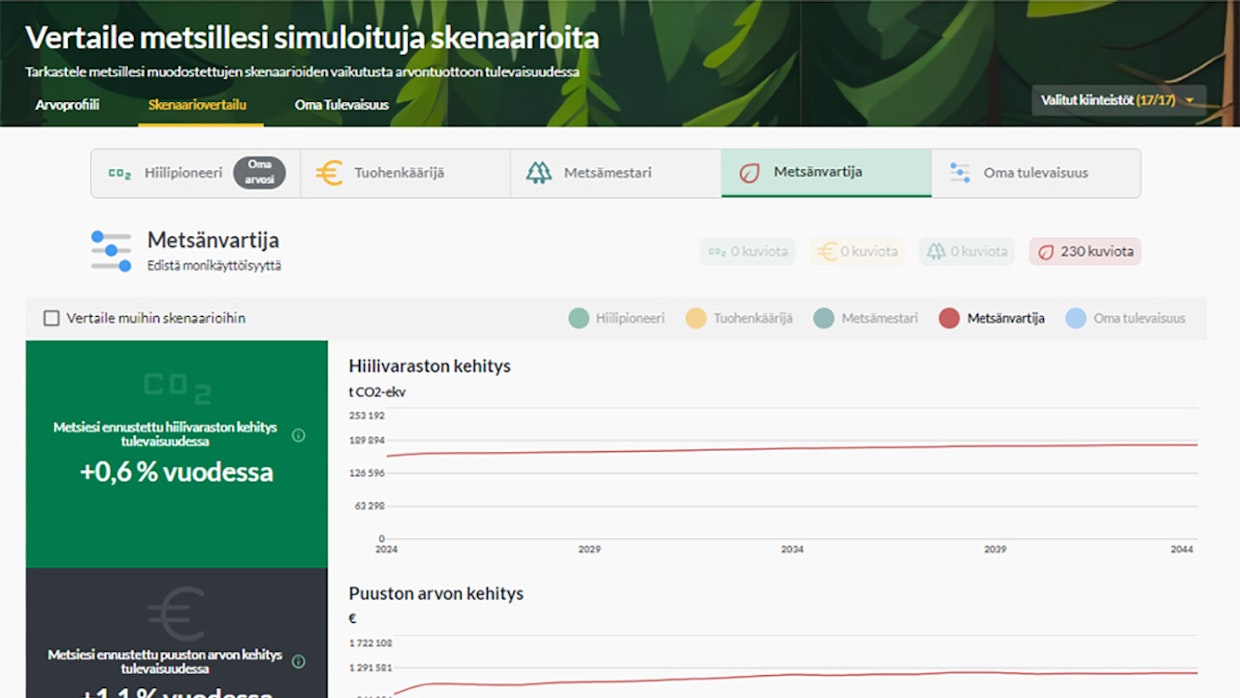 Oman ohjelman lisäksi käyttäjä voi tarkastella myös muita omille metsille mallinnettuja metsänhoidollisia skenaarioita sekä vertailla eri vaihtoehtojen vaikutusta tulevaisuuden arvontuottoon.