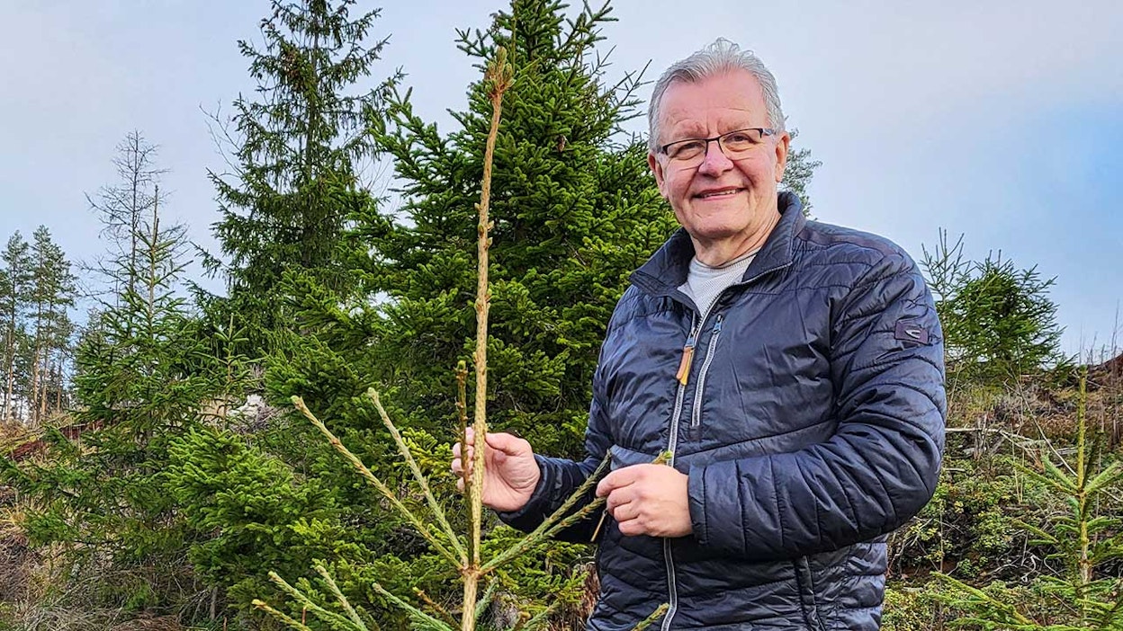 Metsänhoitoyhdistys Uusimaan entinen toiminnanjohtaja Timo Leirimaa ja viisi kesää kasvanut kuusen taimi.“Kun edellinen juttu täsmäravinteesta julkaistiin, puhelin alkoi soimaan heti ja kysyttiin ‘No, mistä tätä ainetta sitten saa?’”