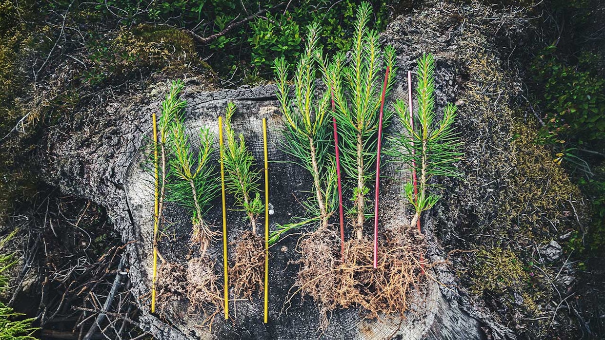 Kuvassa oikealla olevat yhden kesän metsässä kasvaneet taimet ovat saaneet istutuksen yhteydessä täsmäravinnekäsittelyn. Vasemmalla verrokkitaimet.“Moni metsänomistaja panostaa uudistamiseen pelkän minimin, mutta tällä häviää pitkällä tähtäimellä. Jos haluaa olla voittajien joukossa, kannattaa panostaa alussa hieman enemmän ja saada sitä kautta parempia tuloksia ja säästää myöhemmissä kustannuksissa.”