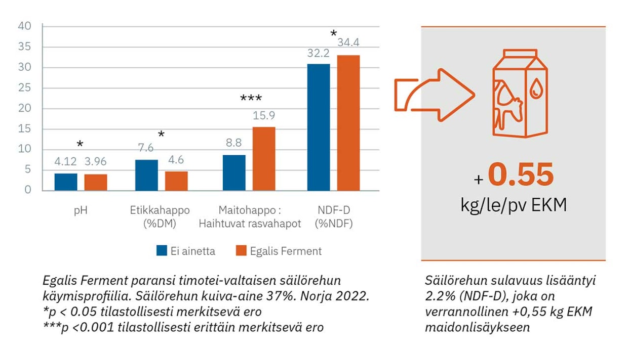 Egalis Ferment on kahden maitohappobakteerin seos, jota käyttämällä saadaan miljoona bakteeria per rehugramma. Tämä varmistaa nopean ja puhtaan maitohappokäymisen entistäkin nopeammin. Säilörehun lopullinen pH saavutetaan hetkessä ja tämä säteilee tuotantoon suurempana maitotuotoksena ja syöntinä. Käymisprosessin puhtaus on etenkin asia, johon ei luonnon omilla bakteerikannoilla päästä vaan ilman aineita tai heikoilla tuotteilla tehdyillä rehuilla syöntiä haittaavat haihtuvat rasvahapot (etikkahappo ja voihappo) valtaavat alaa. Käytännön hyödyt Egaliksen käytöstä ovat mm. korkeampi syönti ja enemmän maitoa!