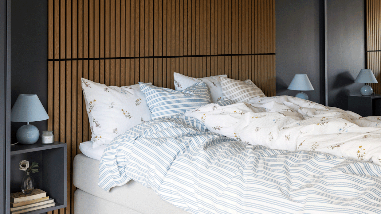 Rustan tämän kevään uutuus on akustiikkapaneeli, joka sopii hyvin sängynpäädyksi. Kuvan vuoteessa on Becky-pussilakanasetti lainekreppiä, jota ei tarvitse silittää.Tyylikäs ja melua vaimentava akustiikkapaneeli makuuhuoneessa