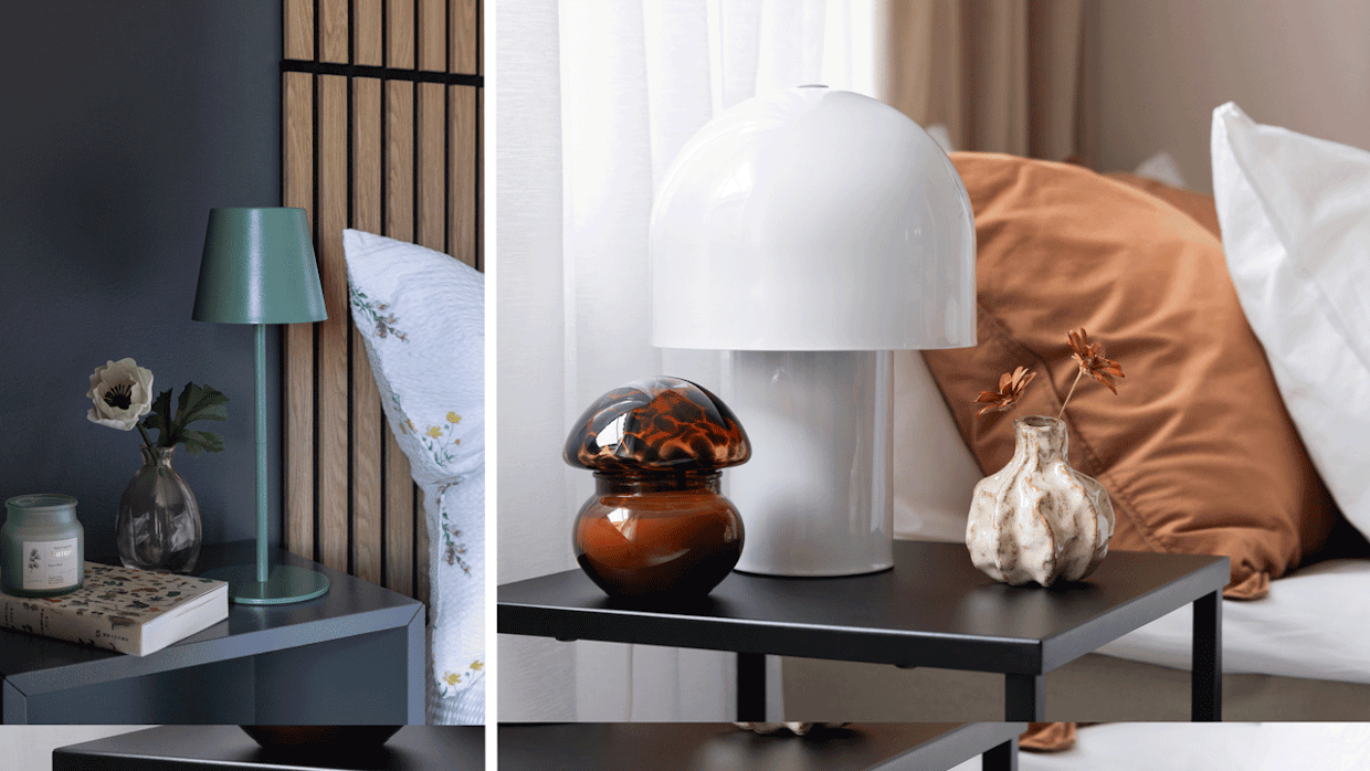 Lukuvalo on hyödyllinen vuoteen vieressä. Johdottomassa Tolosa-valaisimessa on valittavissa kolme eri värilämpötilaa, ja sen korkeutta voidaan säätää. Pyöreä Faro on saatavana useissa kauniissa väreissä. Kuva: Malin Cropper– Käytä mieluiten himmennettäviä valonlähteitä, jotta voit säätää valon voimakkuutta. Panosta useisiin valaisimiin ja laita ne eri paikkoihin ja eri korkeudelle huoneessa, Andrea neuvoo.