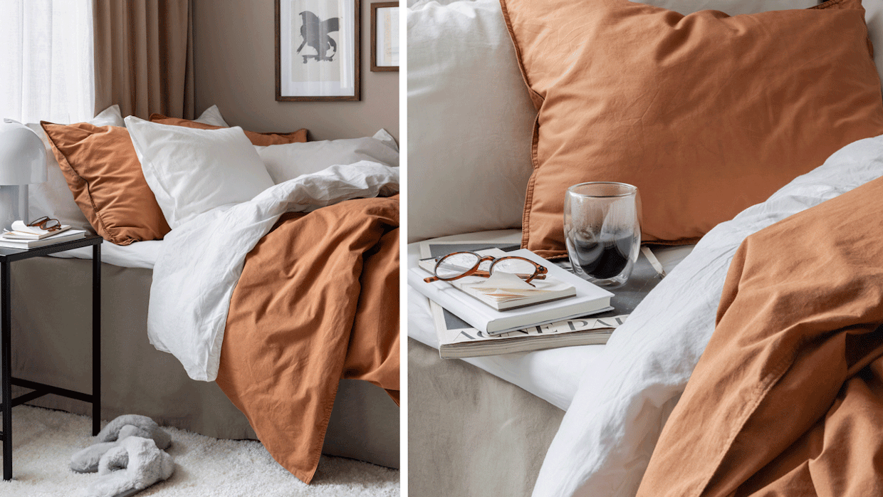– Jos mahdollista, käytä kahta peittoa, niin saat pehmoisen näköisen lopputuloksen. Laita useita erikokoisia tyynyjä nojaamaan seinää tai sängynpäätyä vasten. Viimeistele sijaus päiväpeitteellä ja taita sen toinen lyhyt sivu alas, Andrea vinkkaa.
