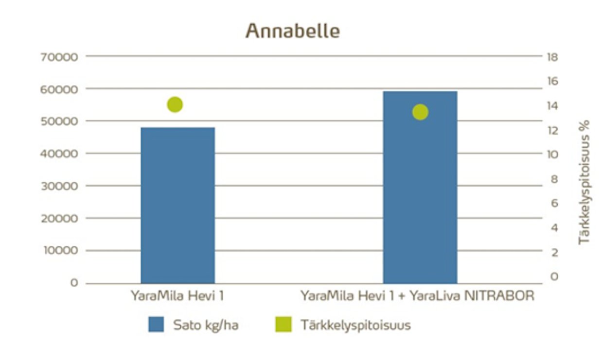 Kuva 1. Lisätyppilannoitus YaraLiva NITRABOR 100 kg/ha sekä optimoitu kasvinsuojelu lisäsivät perunasatoa 8300 kg/ha. Lisääntynyt satopotentiaali varmistettiin kasvukauden aikana rutontorjuntaan yhdistetyllä YaraVita- ja YaraTera-lehtilannoitusohjelmalla. Perunan kevätlannoitus tehtiin YaraMila HeVi 1 –lannoitteella, ja fosforitäydennyksenä oli käytössä Yara STARTTI.Kokeessa käytettiin lisätyppilannoitteena YaraLiva NITRABORia 100 kiloa hehtaarille. Kyseisellä suositusmäärällä saadaan 15 kg typpeä, 18,5 kg kalsiumia ja 0,3 kg booria hehtaarille. Typpi lisää perunasatoa, suurentaa perunan lehtialaa ja pidentää lehtialan kestoa. Kalsium ja boori puolestaan parantavat perunan laatua ja vähentävät sisäistä tummumista.