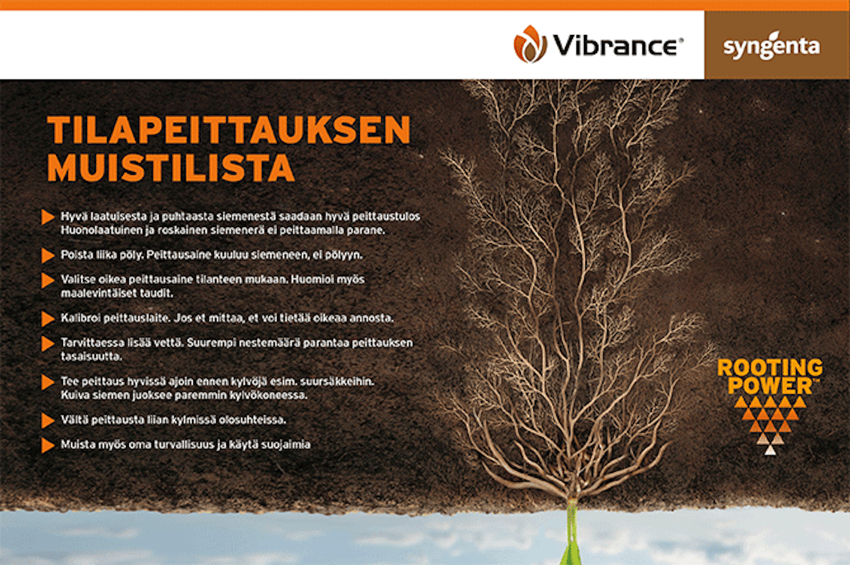 Hyvälaatuinen siemen, luotettava ja tehokas peittausaine, sekä huolellinen peittaustyö antavat hyvän pohjan sadonmuodostuksen alkutaipaleelle.Hyvälaatuinen siemen, luotettava ja tehokas peittausaine, sekä huolellinen peittaustyö antavat hyvän pohjan sadonmuodostuksen alkutaipaleelle. Kun viljan siementen itäminen, orastuminen sekä juuriston kasvu alkuvaiheessa turvataan, luodaan samalla vankka pohja huippusadolle. Ottamalla seuraavat pääkohdat huomioon, rakennetaan hyvä pohja onnistuneelle tilapeittaukselle.