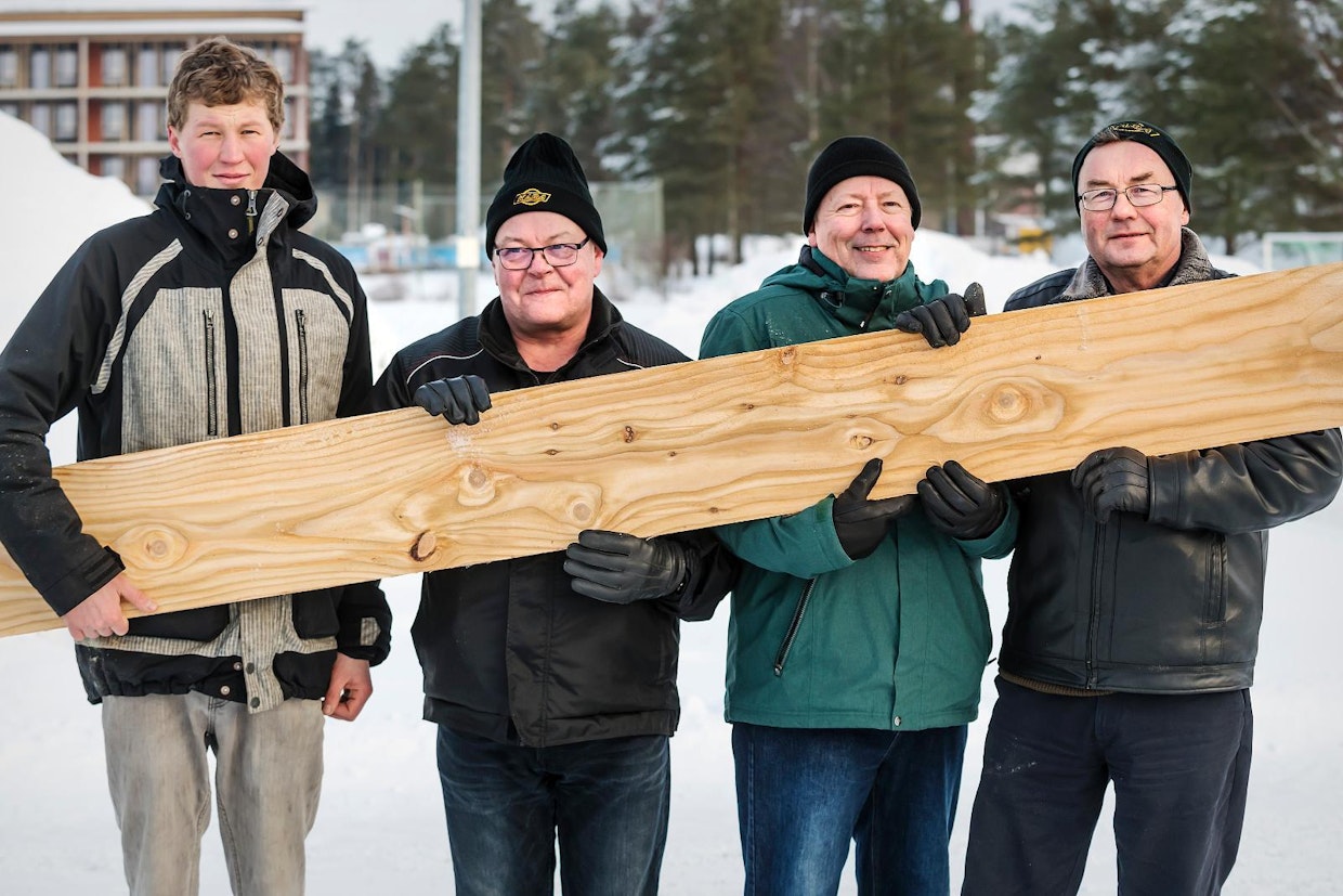 Mikko Nieminen, Pentti Huppunen, Jyrki Huppunen ja Olavi Nieminen ovat yhtä mieltä siitä, että lehtikuusi on oiva valinta myös sisäpanelointiin kauniin pintakuviointinsa vuoksi. Kuva: Johannes Tervo