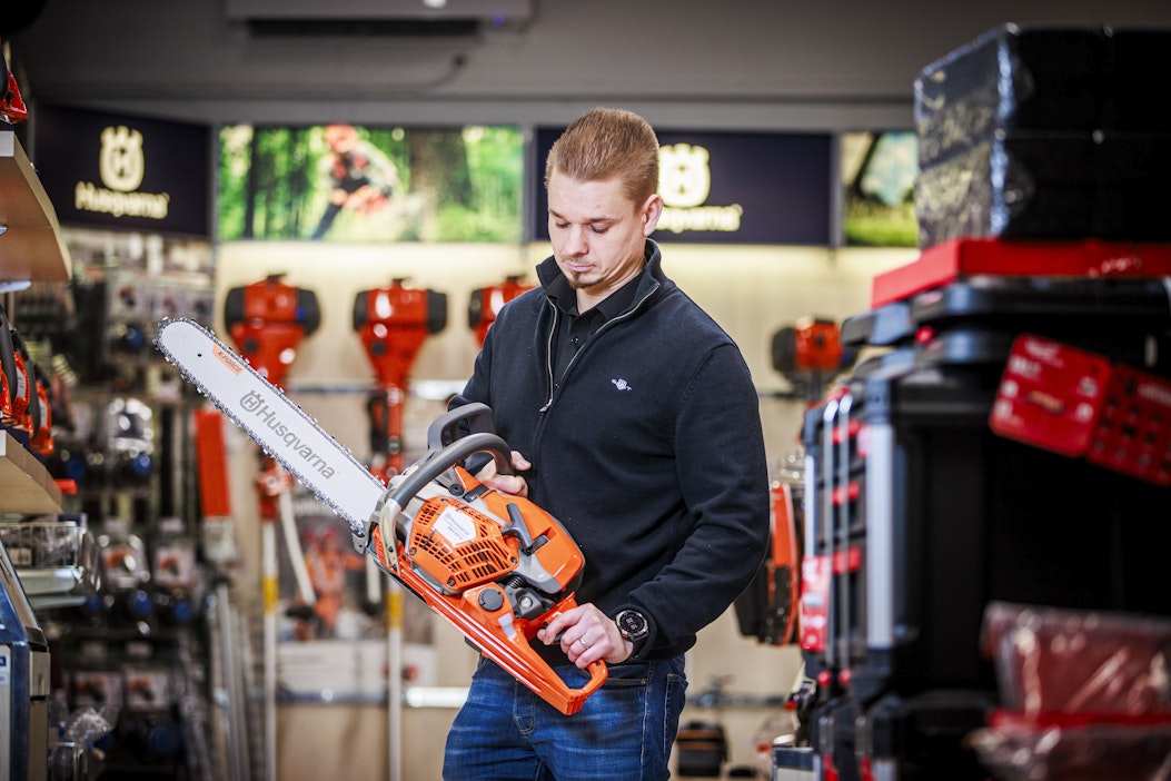 Johtavilla brändeillä on usein esimerkiksi tuotteiden esillepanoon tai henkilökunnan koulutukseen liittyviä vaatimuksia, joita ne asettavat jälleenmyyjille. Kuva: Sanne KatainenMoottori- ja raivaussahat ovat edelleen varastotavaraa. Ne ostetaan yhä useammin verkossa, ja katteet ovat alhaiset. Oikean Konekaupan tavoitteena on erottautua tarjoamalla huoltoa.