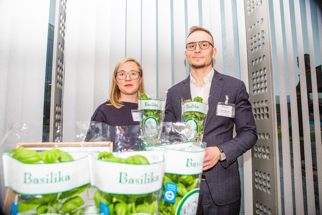 Welmu Internationalin teknologiajohtaja Martta Asikainen ja toimitusjohtaja Jaakko Kaminen esittelivät tiistaina Helsingissä puupohjaista pakkausmateriaaliaan. Ensimmäinen demovaiheen tuote valmistettiin Järvikylä-brändin yrteille. Kuva: Hanna LinnoveMuovilta näyttävä ja käteen tuntuva kalvo kietoutuu monille suomalaisille tutun Järvikylän basilikapuskan ympärille.