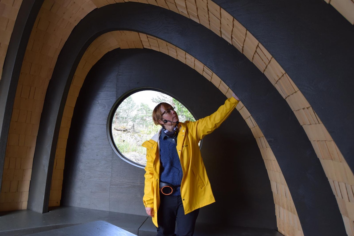 Metsä Groupin viestinnän asiantuntija Annamari Heikkinen esitteli puista laavua. Kaaret mukailevat sisäkkäin pieneneviä puun lustoja. Kuva: Anni-Sofia HoppiMitä tapahtuu, kun katselee metsää uusin silmin lisätyn todellisuuden läpi? Ainakin se, että tabletin ruudulla näkyvästä metsästä voi kaataa puun. Turvavarusteita ei tällä kertaa tarvita, sillä sahan terä vilahtaa vain hetken aikaa näytöllä.