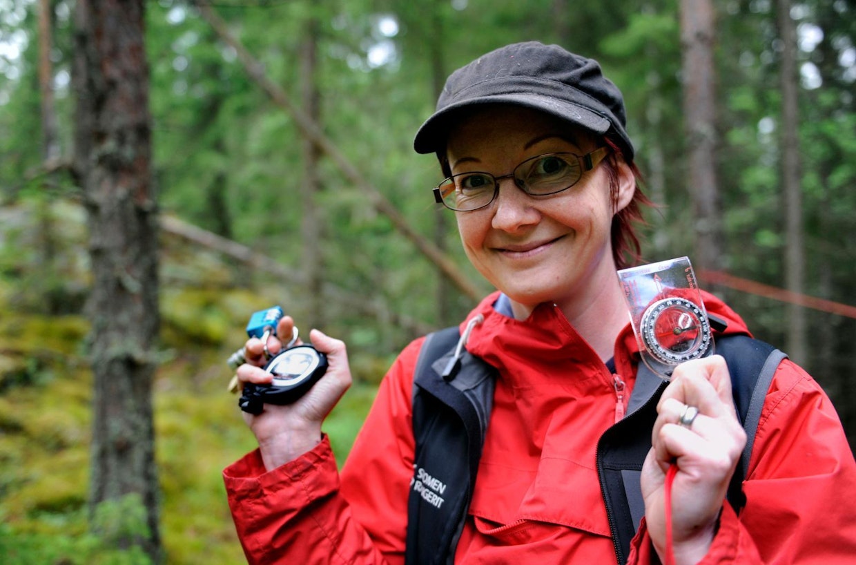 Erä- ja luonto-opas Marika Hänninen seuraa tapahtumia leirin vierellä. Muutaman kerran hän antaa vihjeen, kun ryhmän työskentely jumiutuu. Kuva: Johannes WiehnPark Ranger Marika Hänninen on johdattanut Aarteen tutkimusryhmän perille Repoveden kansallispuistoon. Hän on erä- ja luonto-opas metsäelämyksiä tarjoavassa Tervarummussa.